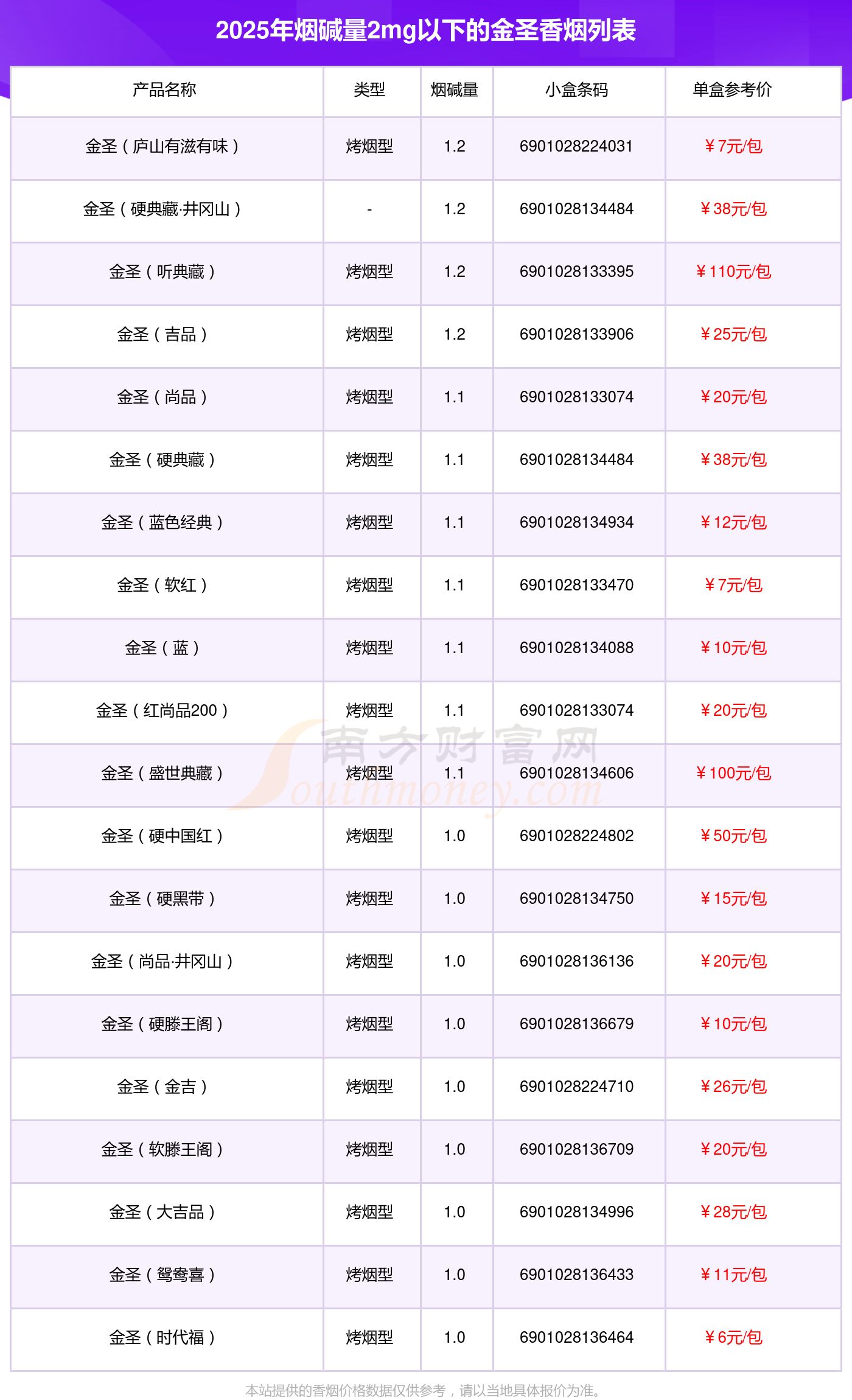 擇煙網為大家盤點了煙堿量2mg以下的金圣香煙,分別有金圣(廬山有滋有味)、金圣(硬典藏·井岡山)、金圣(聽典藏)、金圣(吉品)、金圣(尚品)、金圣(硬典藏)、金圣(藍色經典)、金圣(軟紅)、金圣(藍)、金圣(紅尚品200)等,具體價格如下: