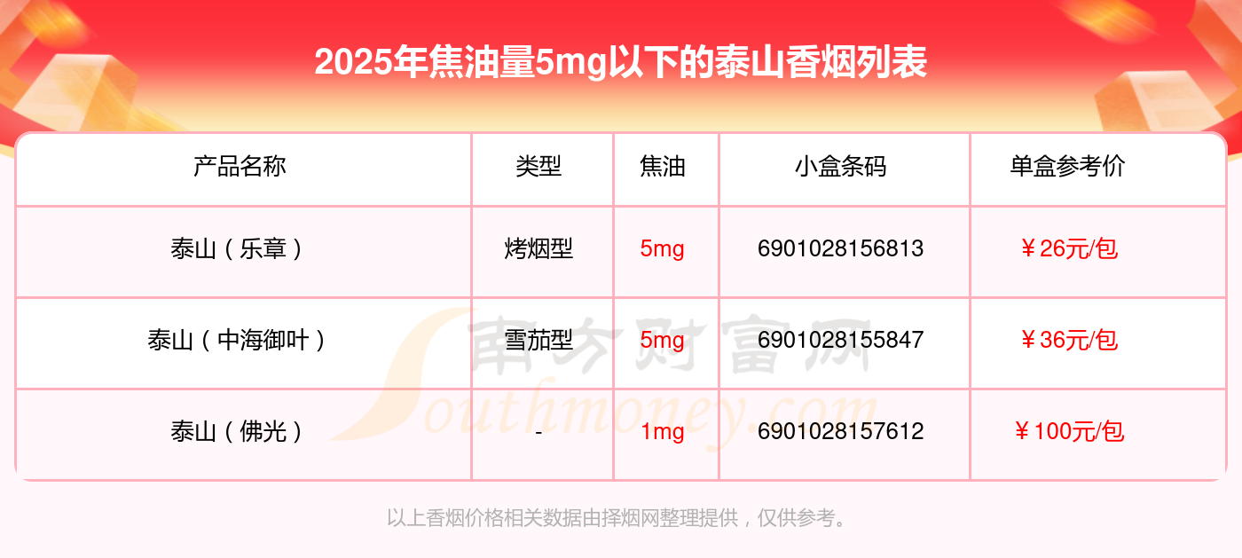 擇煙網(wǎng)為大家盤(pán)點(diǎn)了泰山香煙焦油量5mg以下的,分別有泰山(樂(lè)章)、泰山(中海御葉)、泰山(佛光)等,具體價(jià)格如下: