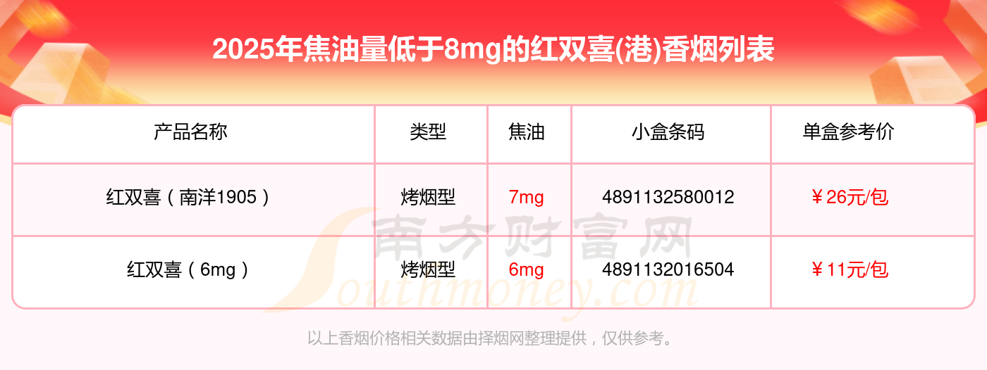 紅雙喜(港)香煙焦油量低于8mg的有哪些?擇煙網(wǎng)為大家整理提供,分別有: