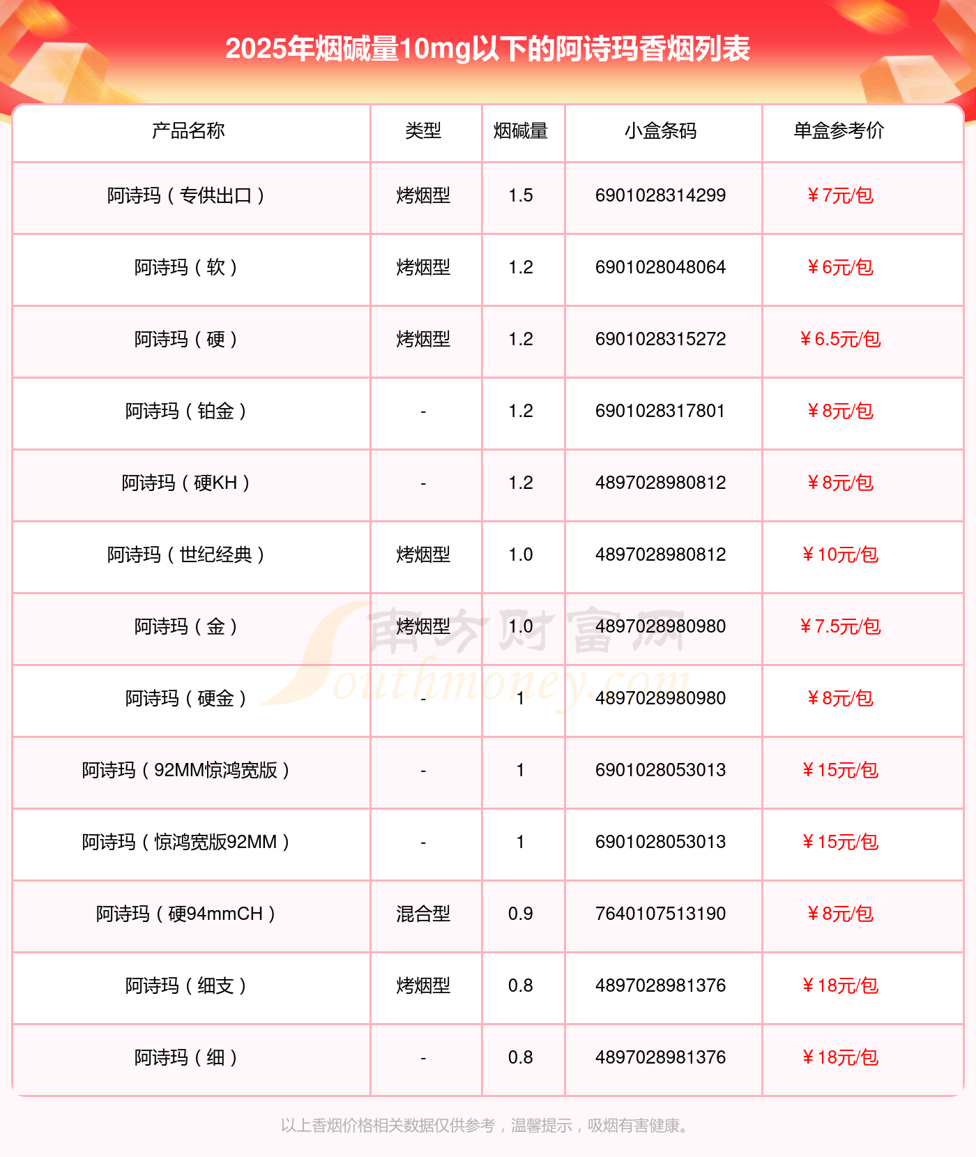 阿詩(shī)瑪香煙煙堿量10mg以下的有哪些?擇煙網(wǎng)為大家整理提供,分別有: