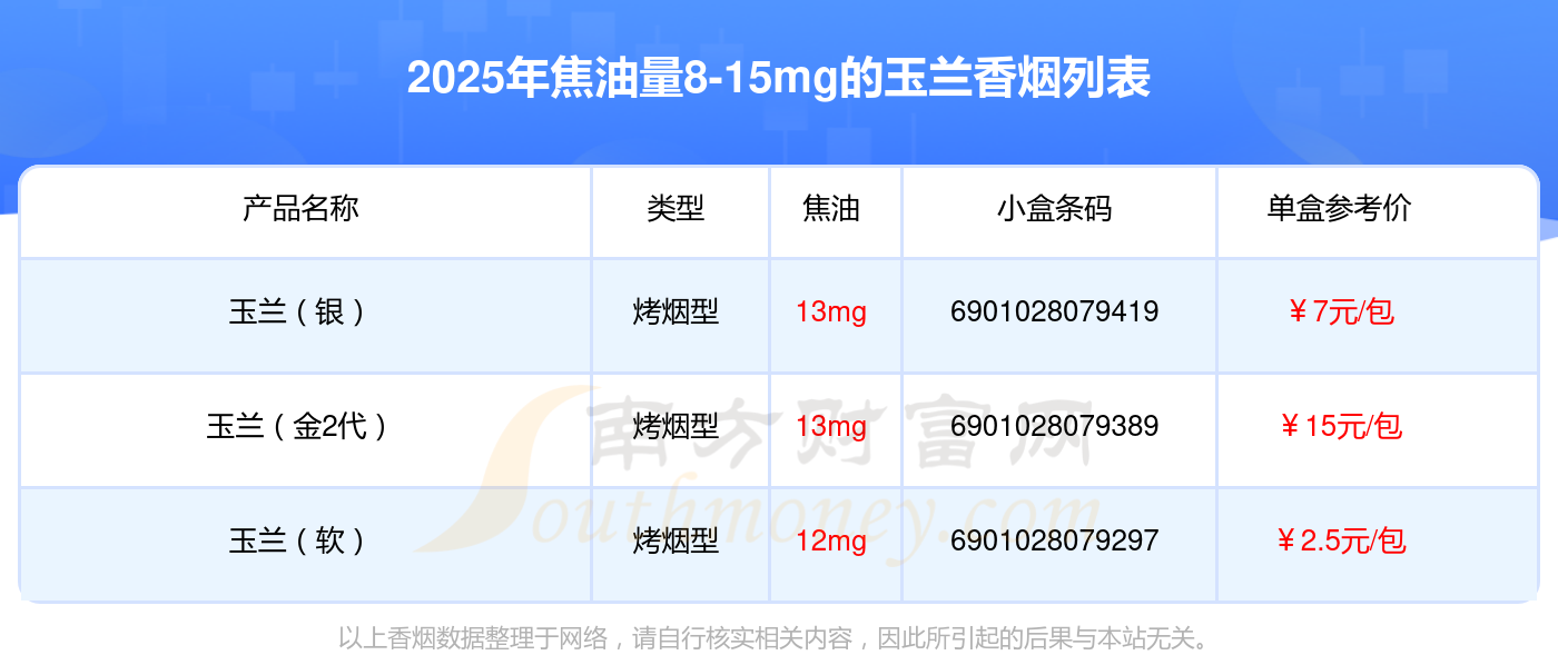 玉蘭香煙焦油量8-15mg的煙有玉蘭(銀)、玉蘭(金2代)、玉蘭(軟)等,詳細(xì)價格如下: