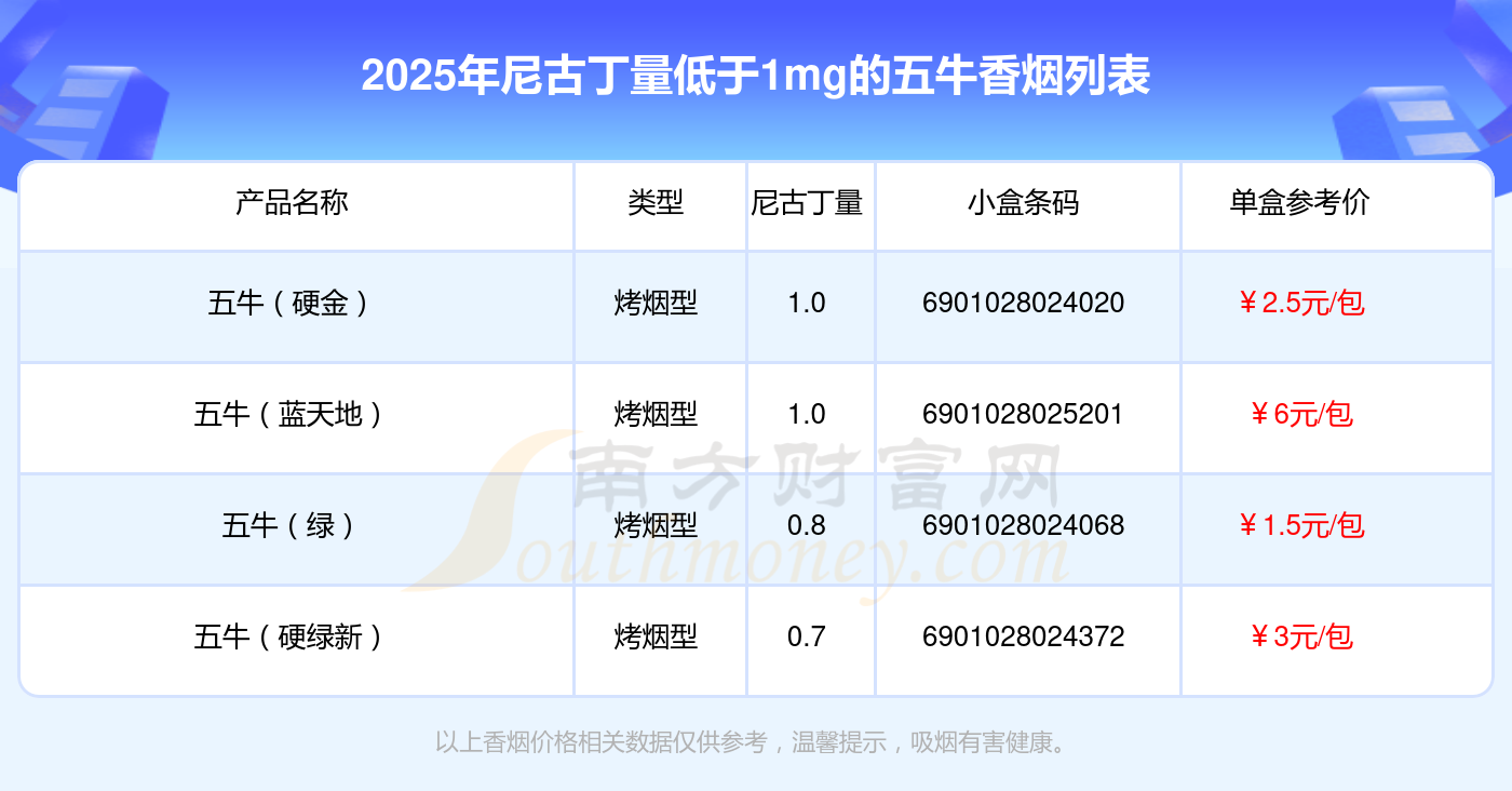 擇煙網為大家盤點了尼古丁量低于1mg的五牛香煙,有以下這些: