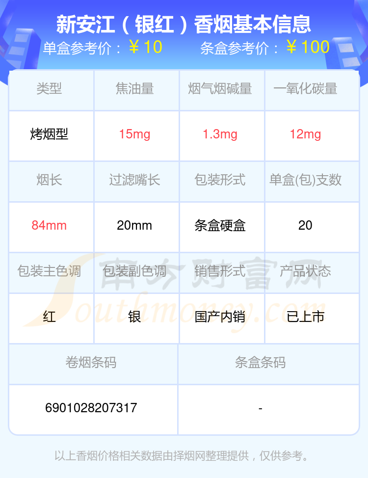 擇煙網(wǎng)為大家盤點(diǎn)了新安江香煙尼古丁量5mg以下的,分別有新安江(軟)、新安江(藍(lán))、新安江(銀紅)等,具體價(jià)格如下: