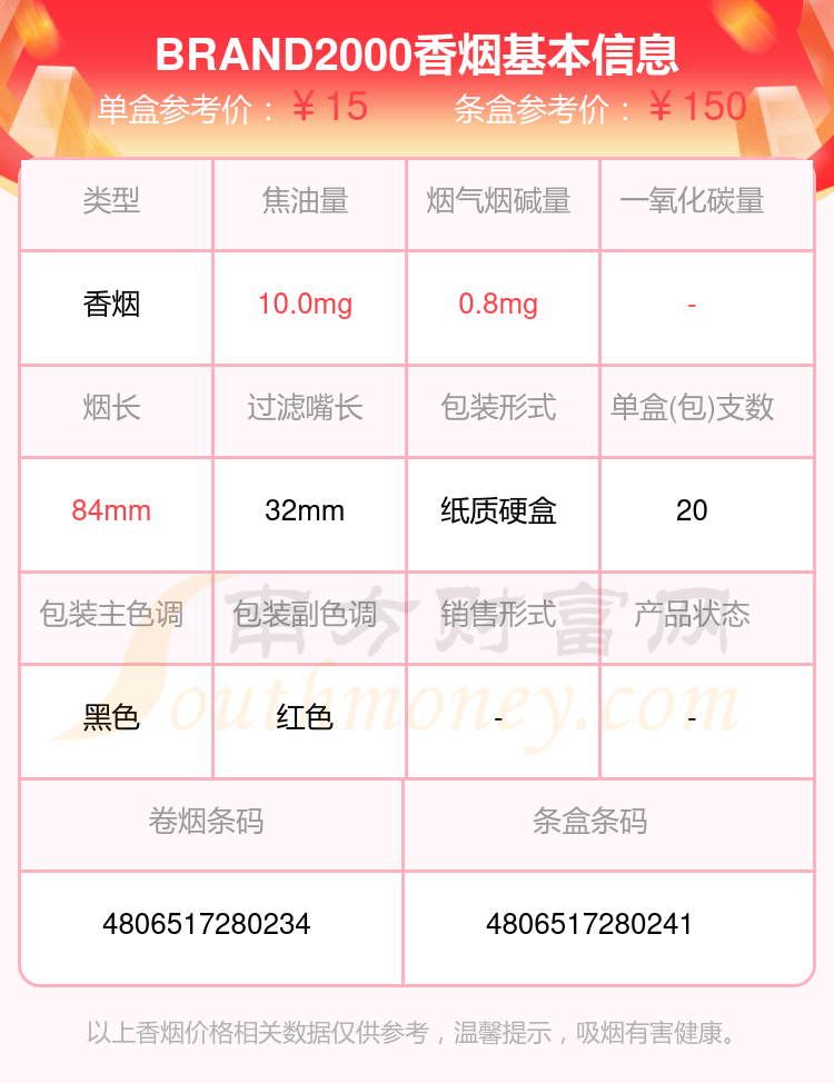 尼古丁量低于1mg的BRAND2000香煙有哪些?擇煙網(wǎng)為大家整理盤點(diǎn),有BRAND2000、BRAND2000等,詳細(xì)價(jià)格如下: