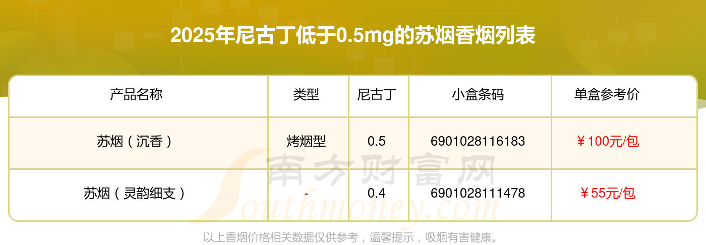 擇煙網(wǎng)為大家盤(pán)點(diǎn)了尼古丁低于0.5mg的蘇煙香煙,有以下這些:
