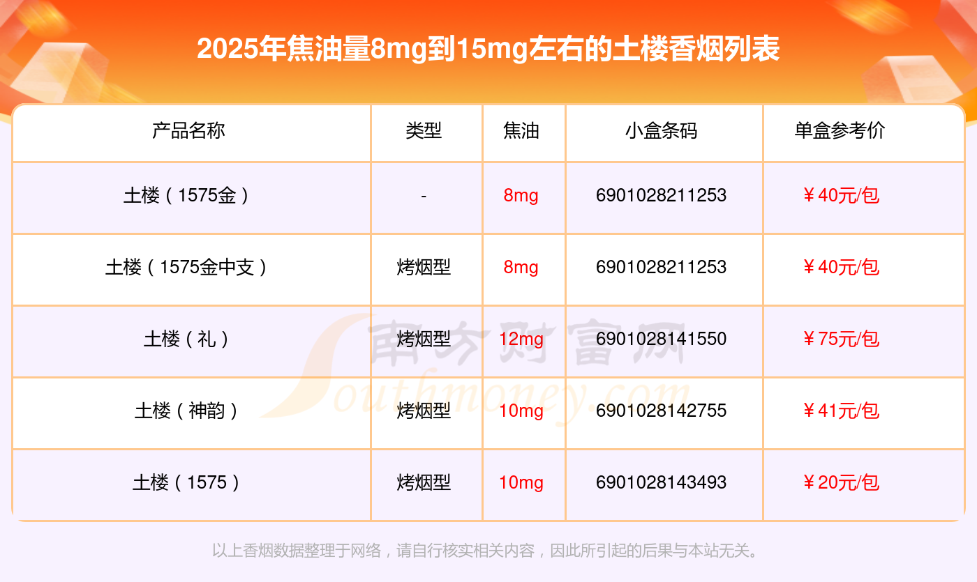 擇煙網(wǎng)為大家盤(pán)點(diǎn)了焦油量8mg到15mg左右的土樓香煙,分別有土樓(1575金)、土樓(1575金中支)、土樓(禮)、土樓(神韻)、土樓(1575)等,具體價(jià)格如下: