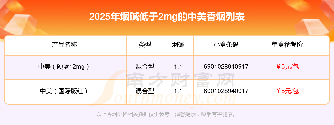 中美(硬藍12mg)參考價5元/包、中美(國際版紅)參考價5元/包等。