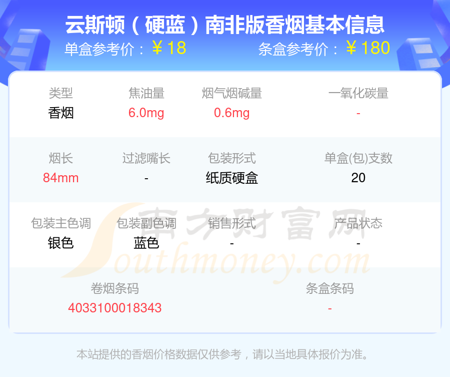 擇煙網(wǎng)為大家盤點了煙堿量低于10mg的Winston(云斯頓)香煙,分別有云斯頓(經(jīng)典澳門版)、云斯頓(硬紅)歐盟免稅版、云斯頓(硬藍)南非版、云斯頓(硬藍)歐盟免稅版、云斯頓(藍俄羅斯版)、云斯頓(鐵盒)俄羅斯版等,具體價格如下: