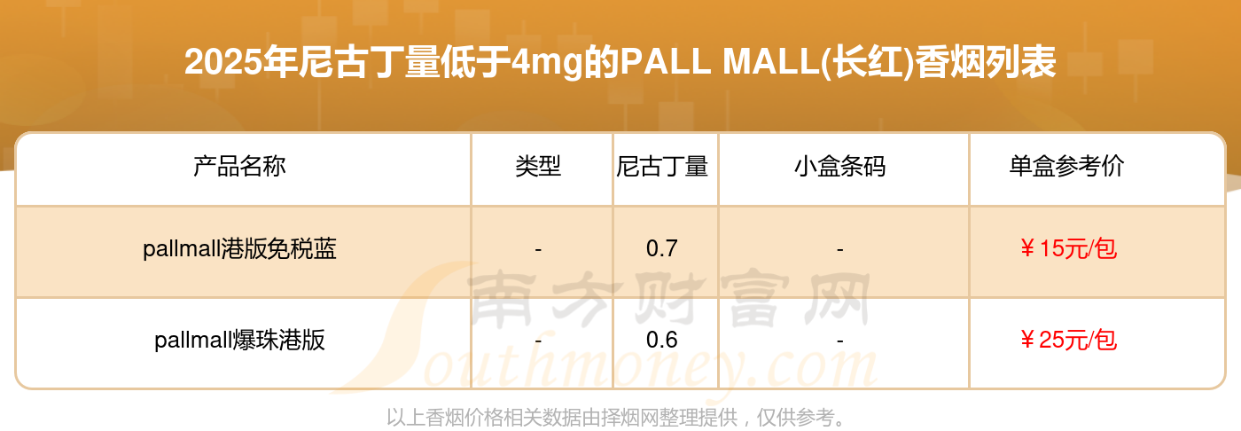 尼古丁量低于4mg的PALL MALL(長(zhǎng)紅)香煙有哪些?擇煙網(wǎng)為大家整理盤(pán)點(diǎn),分別有:pallmall港版免稅藍(lán)、pallmall爆珠港版等,具體價(jià)格如下: