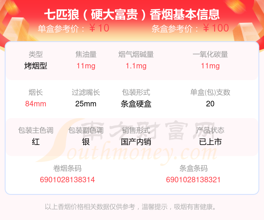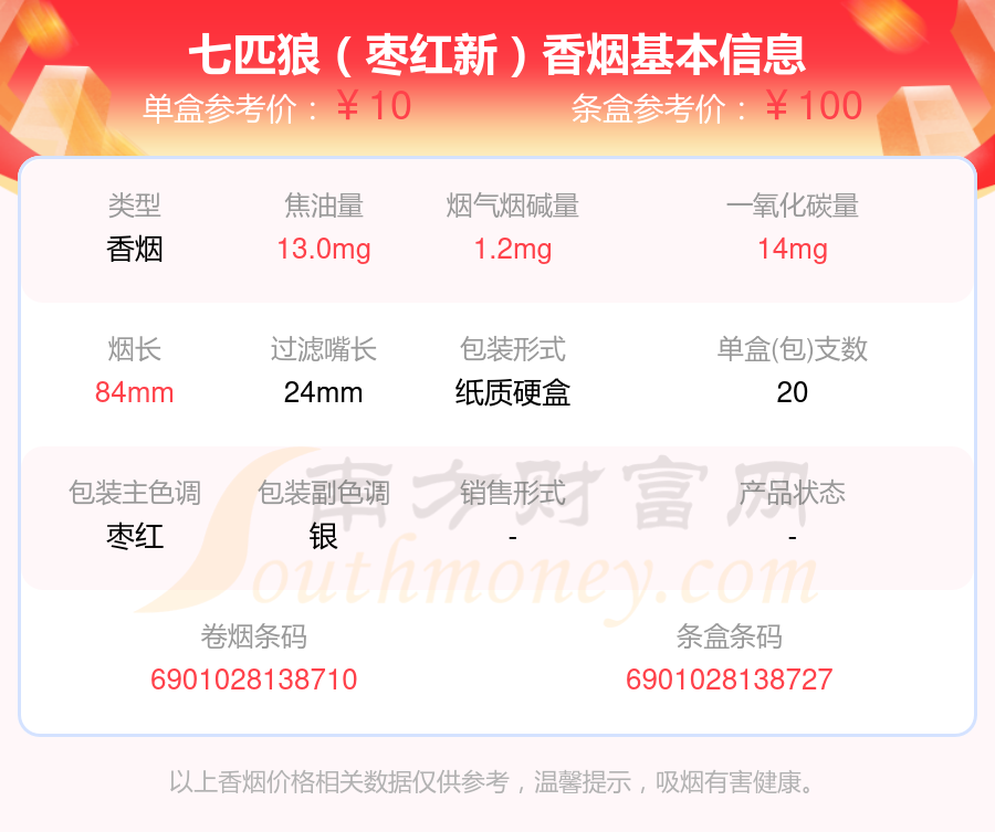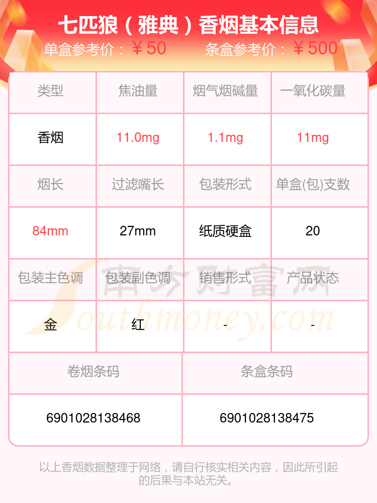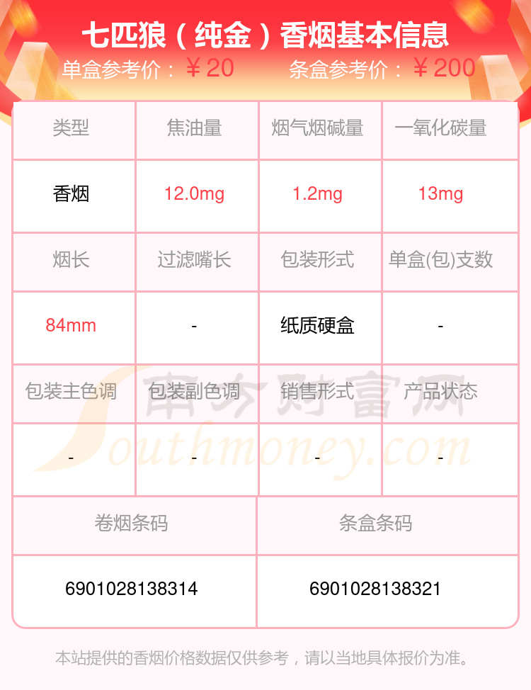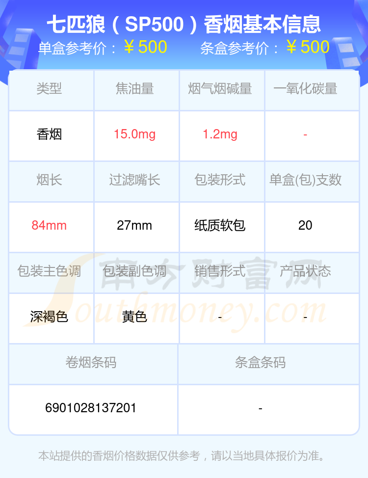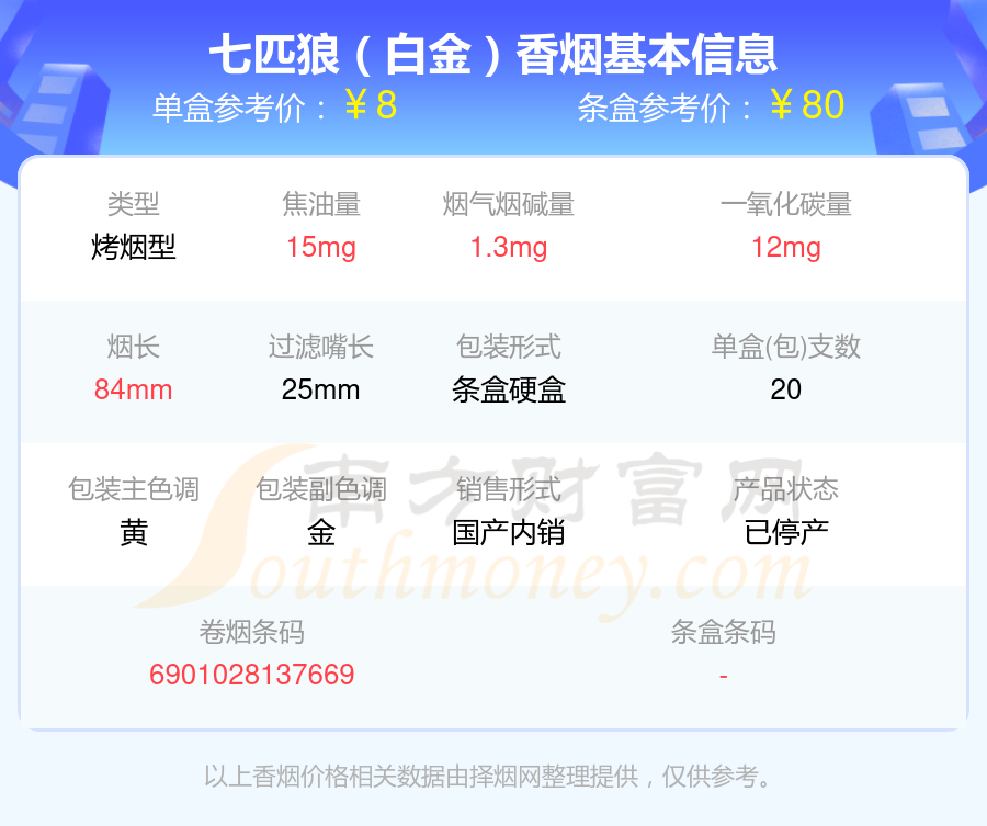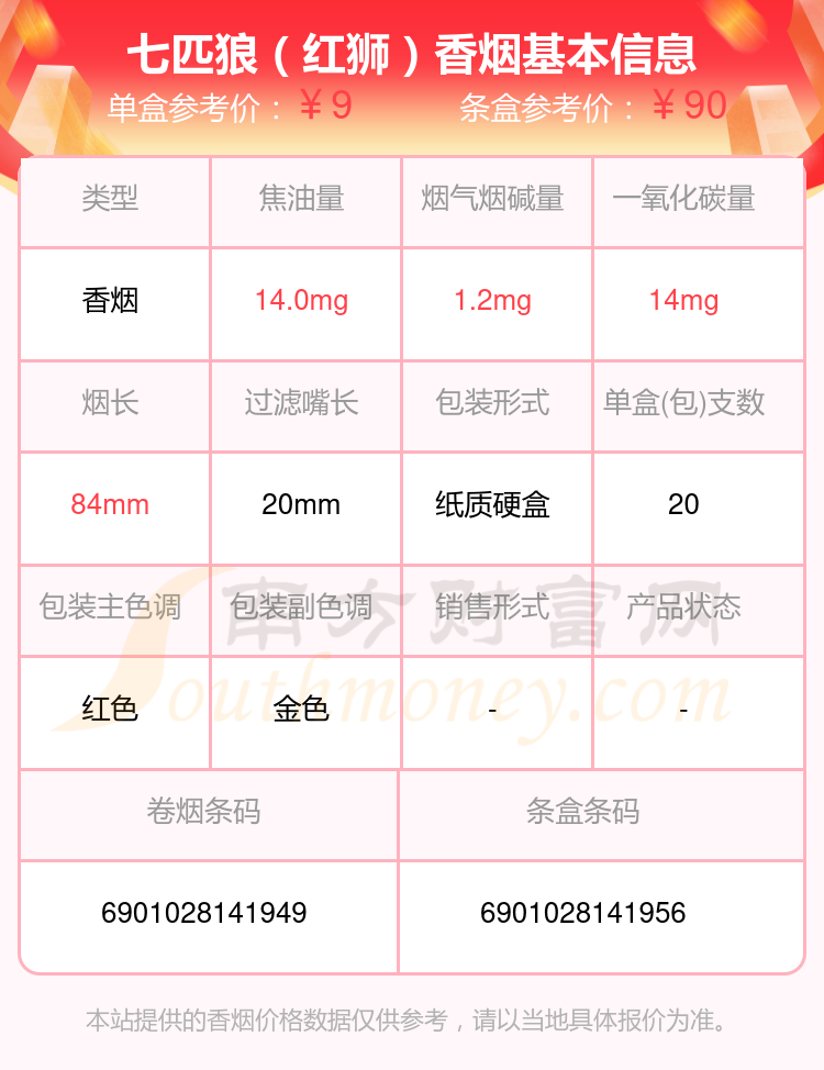 七匹狼(白金)參考價8元/包、七匹狼(棗紅新)參考價10.0元/包、七匹狼(紅金)參考價12.0元/包、七匹狼(紅獅)參考價9.0元/包、七匹狼(SP500)參考價500.0元/包、七匹狼(純金)參考價20.0元/包、七匹狼(硬大富貴)參考價10元/包、七匹狼(雅典)參考價50.0元/包、七匹狼(慶典)參考價18.0元/包、七匹狼(尚品)參考價31.0元/包等。