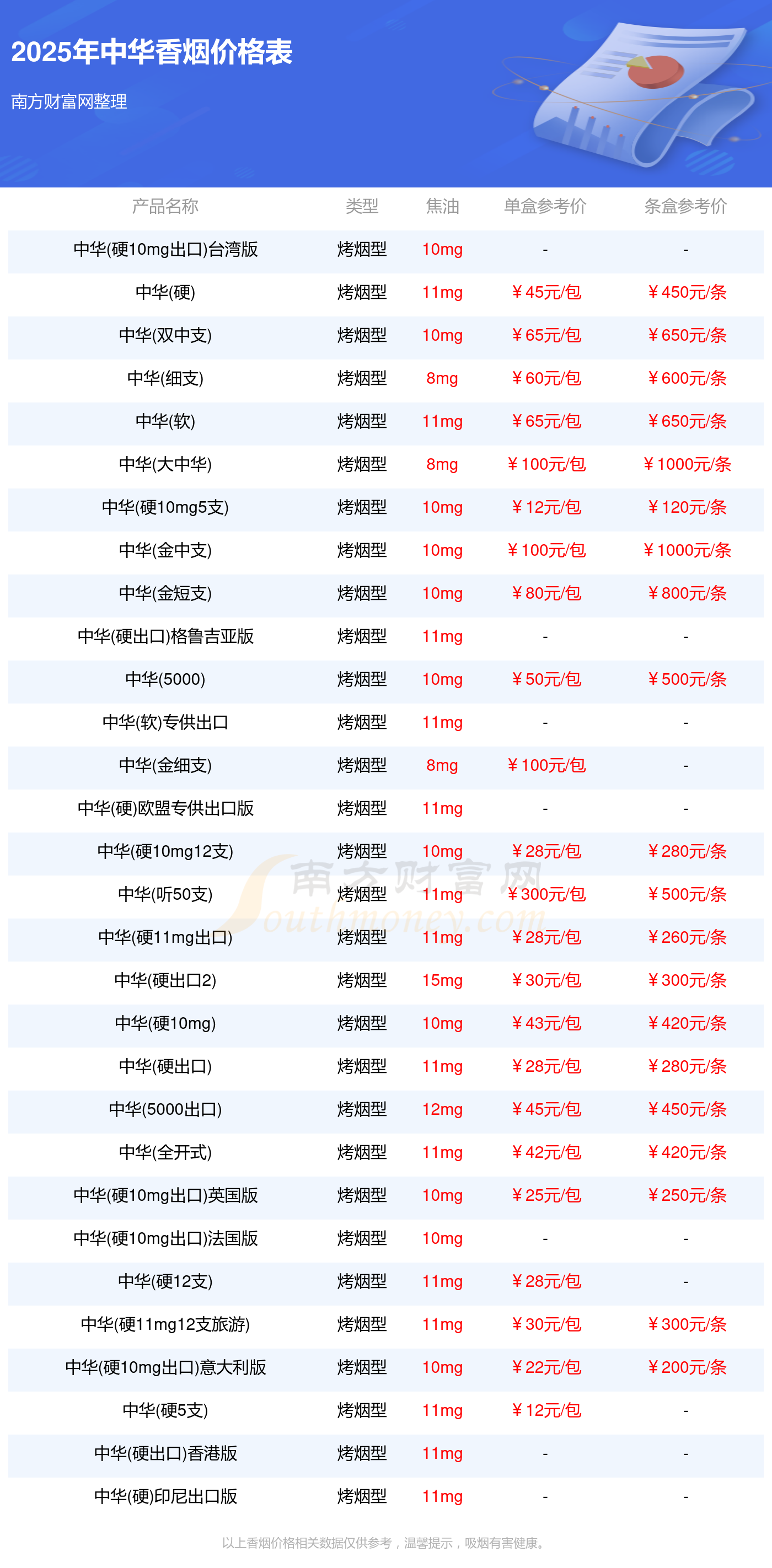 中華香煙最新價格2025:中華(聽50支)參考價300.0元/包、中華(大中華)參考價100.0元/包、中華(金中支)參考價100.0元/包、中華(金細支)參考價100.0元/包、中華(金短支)參考價80.0元/包、中華(軟)參考價65.0元/包、中華(雙中支)參考價65.0元/包、中華(細支)參考價60.0元/包。