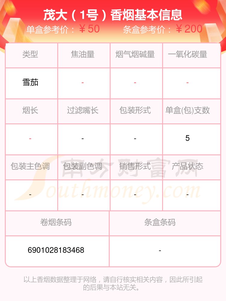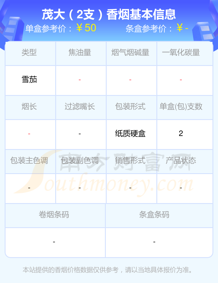 茂大香煙50元~100元左右的煙分別有茂大(2支)參考價50.0元/包、茂大(1號)參考價50.0元/包等。