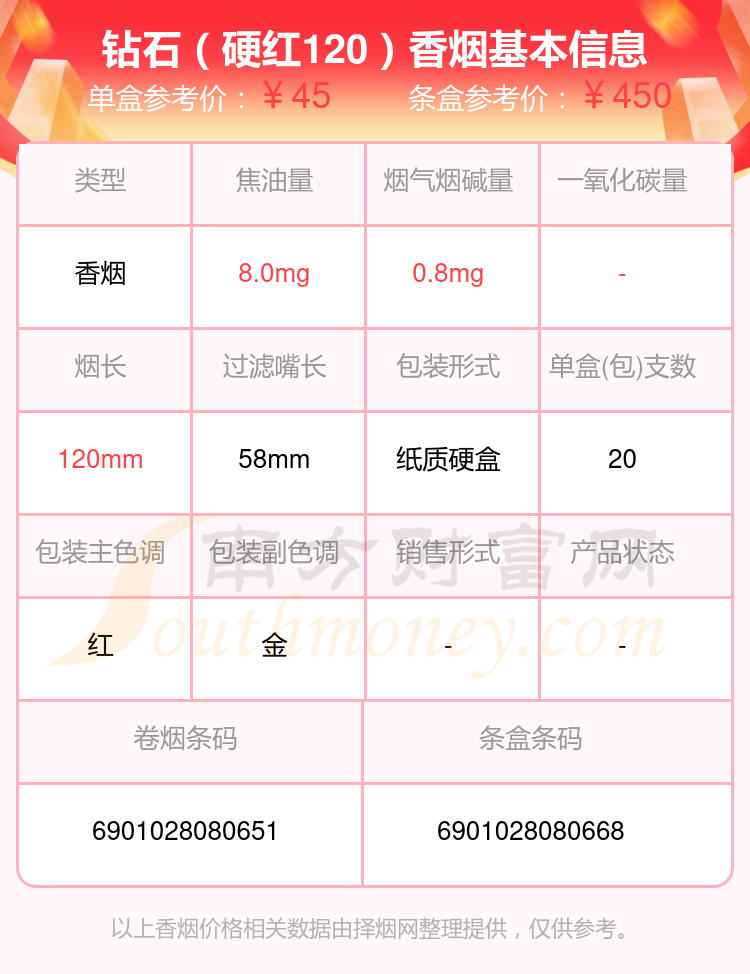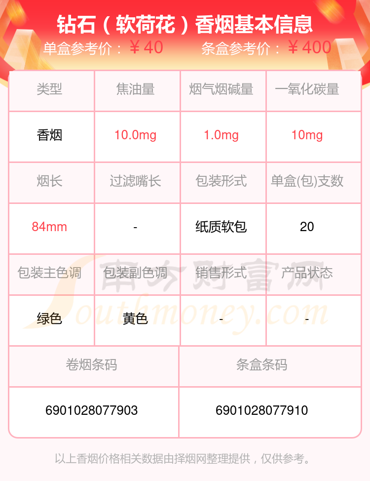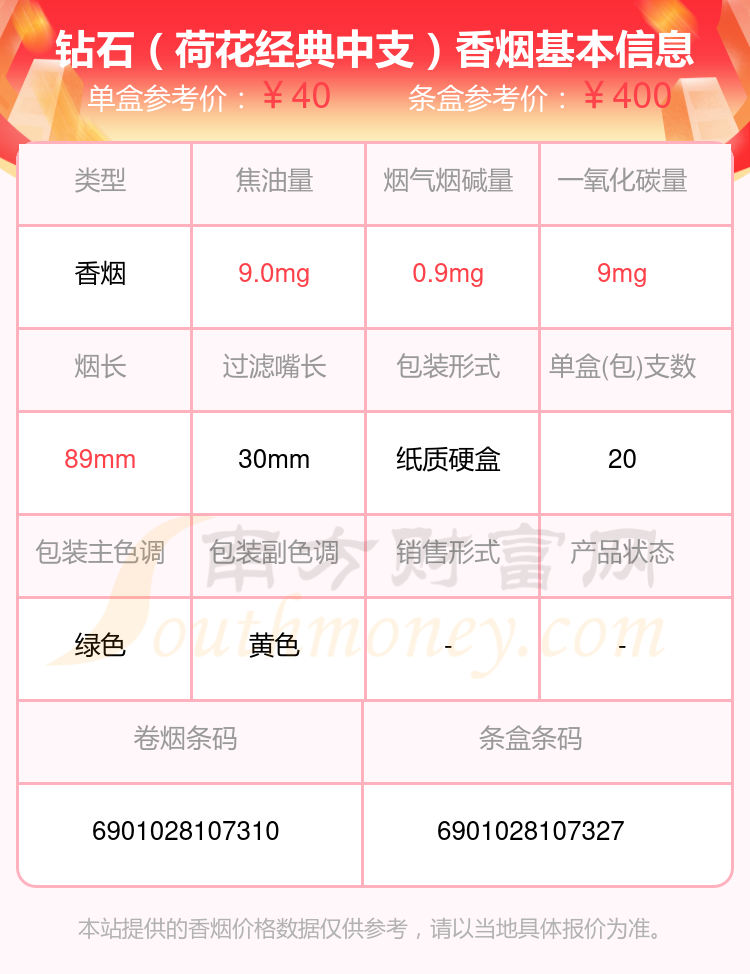 鉆石(雙中支荷花)參考價50.0元/包、鉆石(大好河山)參考價50.0元/包、鉆石(軟珍品)參考價48.0元/包、鉆石(硬紅120)參考價45.0元/包、鉆石(軟紫)參考價45.0元/包、鉆石(細(xì)支荷花)參考價42.0元/包、鉆石(軟荷花)參考價40.0元/包、鉆石(荷花經(jīng)典中支)參考價40.0元/包等。