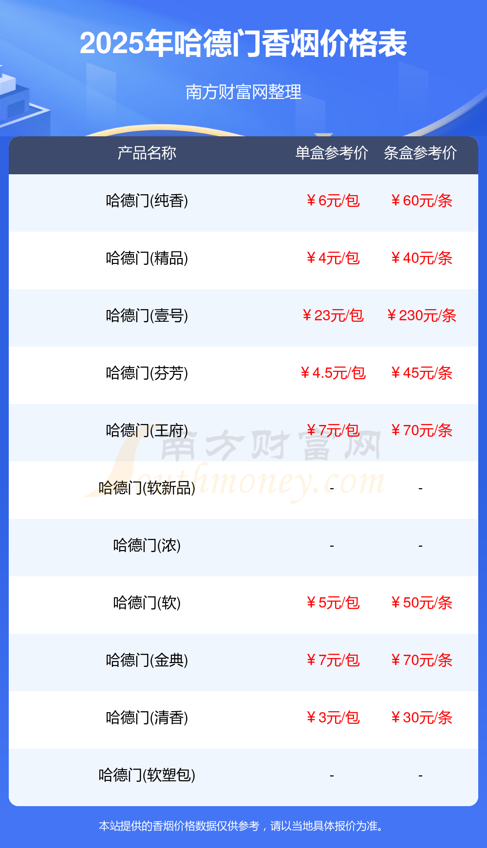 哈德門(壹號(hào))參考價(jià)23.0元/包、哈德門(金典)參考價(jià)7.0元/包、哈德門(王府)參考價(jià)7.0元/包、哈德門(純香)參考價(jià)6.0元/包、哈德門(軟)參考價(jià)5.0元/包、哈德門(芬芳)參考價(jià)4.5元/包、哈德門(精品)參考價(jià)4.0元/包。