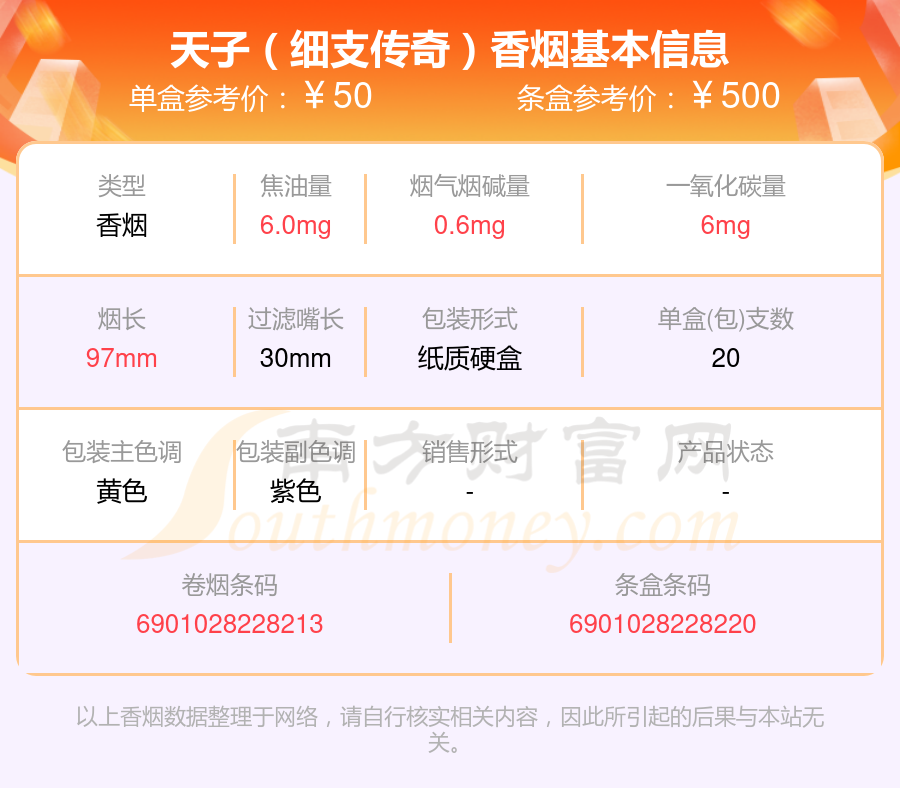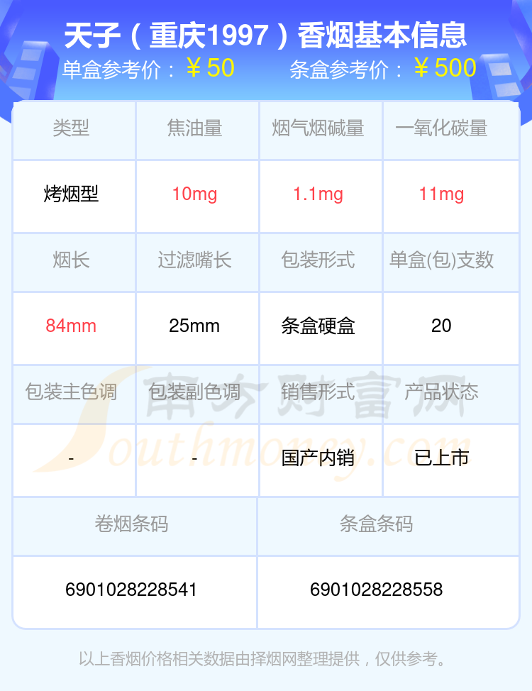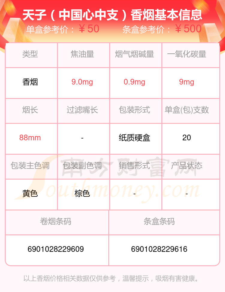 天子香煙四十元到六十元左右的煙分別有天子(軟黃)老版參考價(jià)50.0元/包、天子(中國(guó)心中支)參考價(jià)50.0元/包、天子(細(xì)支傳奇)參考價(jià)50.0元/包、天子(1997)參考價(jià)50.0元/包、天子(重慶1997)參考價(jià)50元/包、天子(傳奇細(xì)支)參考價(jià)50元/包、天子(軟黃)參考價(jià)45.0元/包、天子(黃中支)參考價(jià)40.0元/包等。