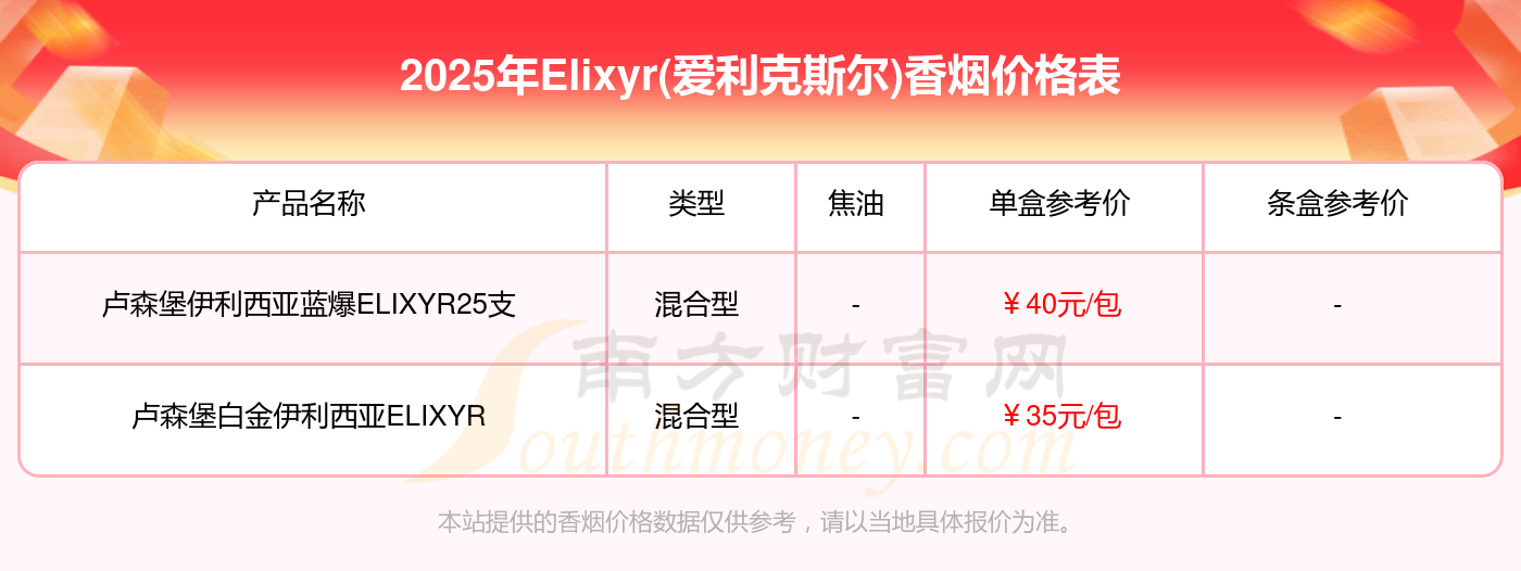 Elixyr(愛(ài)利克斯?fàn)?香煙最新價(jià)格2025:盧森堡伊利西亞藍(lán)爆ELIXYR25支參考價(jià)40.0元/包、盧森堡白金伊利西亞ELIXYR參考價(jià)35.0元/包。