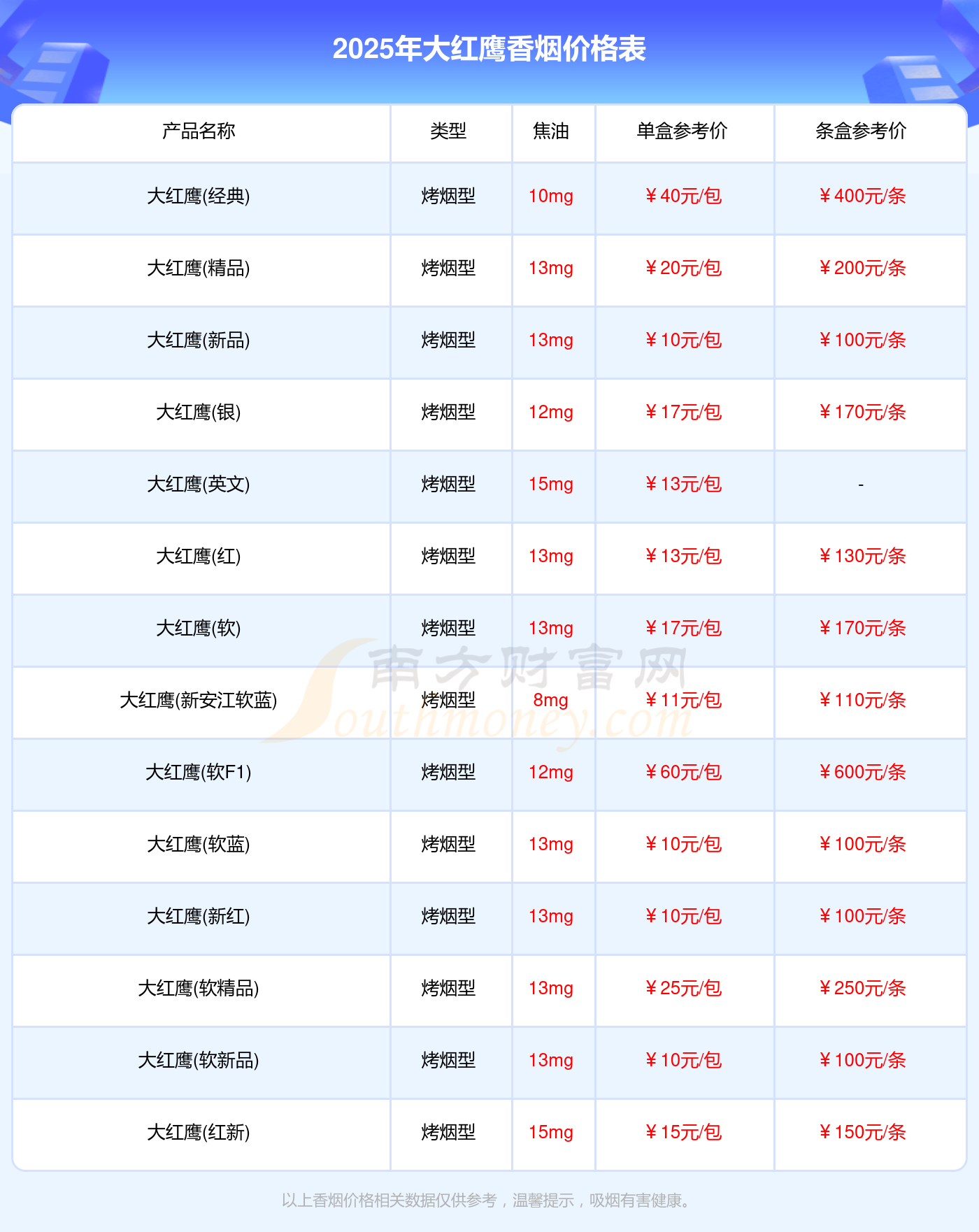 大紅鷹(軟F1)參考價(jià)60.0元/包、大紅鷹(經(jīng)典)參考價(jià)40.0元/包、大紅鷹(軟精品)參考價(jià)25.0元/包、大紅鷹(精品)參考價(jià)20.0元/包、大紅鷹(軟)參考價(jià)17.0元/包、大紅鷹(銀)參考價(jià)17.0元/包、大紅鷹(紅新)參考價(jià)15.0元/包、大紅鷹(英文)參考價(jià)13.0元/包。