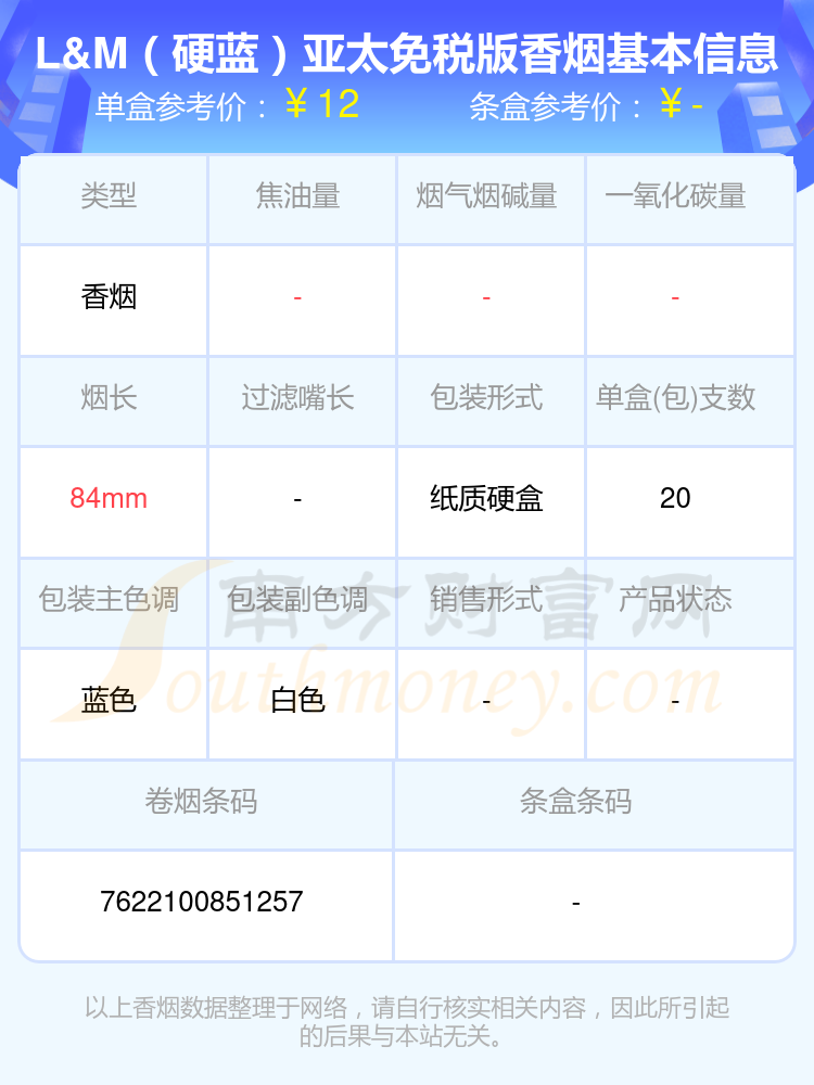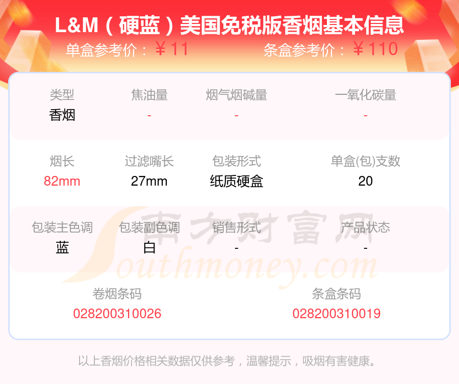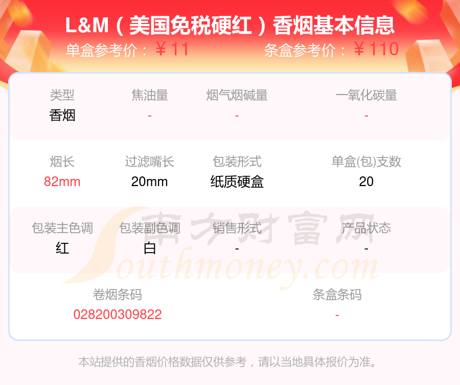 L&M香煙10至20元的煙有哪些?擇煙網(wǎng)為大家整理提供,分別有:L&M(硬藍(lán))亞太免稅版、L&M(美國(guó)免稅硬紅)、L&M(硬藍(lán))美國(guó)免稅版、L&M(硬藍(lán))烏拉圭免稅版等,具體價(jià)格如下: