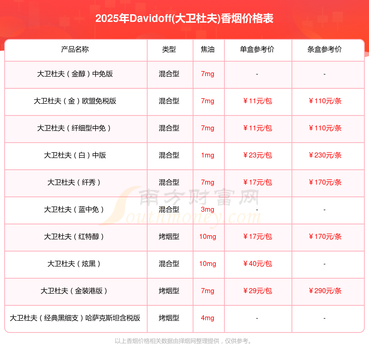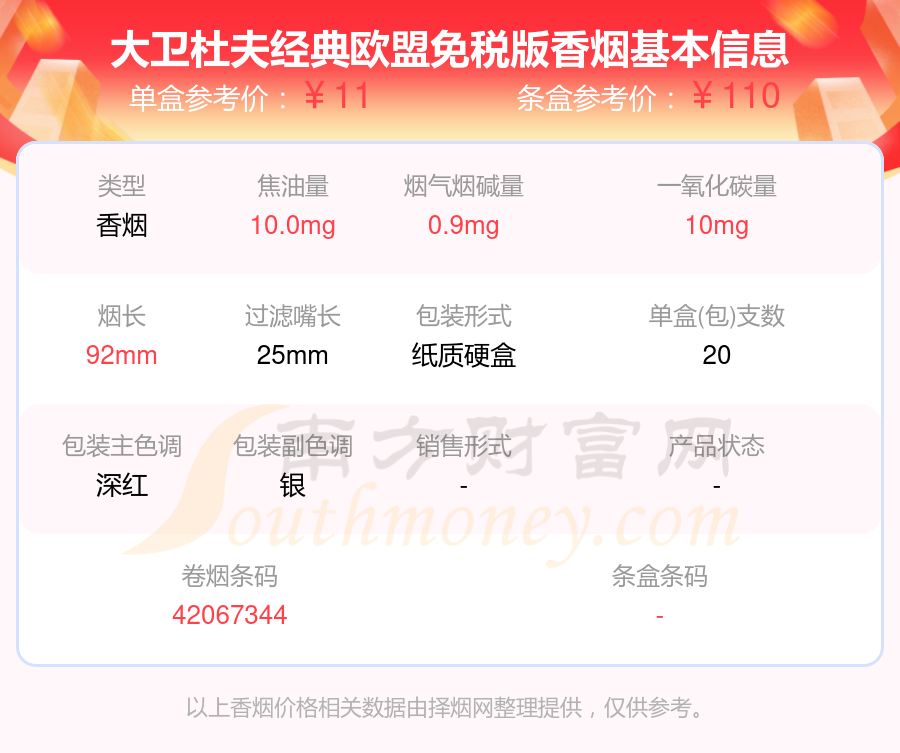 大衛(wèi)杜夫經(jīng)典歐盟免稅版單盒參考價:11元