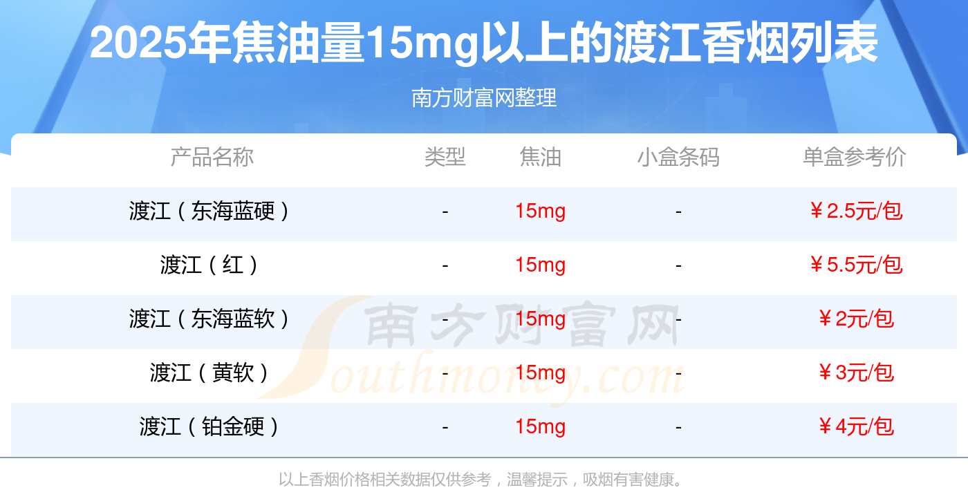 擇煙網(wǎng)為大家盤點(diǎn)了焦油量15mg以上的渡江香煙,分別有渡江(東海藍(lán)硬)、渡江(紅)、渡江(東海藍(lán)軟)、渡江(黃軟)、渡江(鉑金硬)等,具體價格如下: