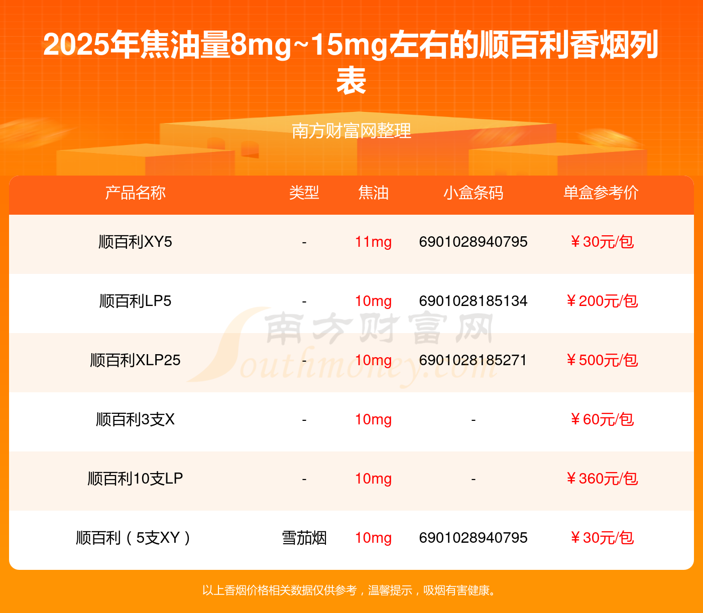 順百利XY5參考價30元/包、順百利LP5參考價200元/包、順百利XLP25參考價500元/包、順百利3支X參考價60元/包、順百利10支LP參考價360元/包、順百利(5支XY)參考價30元/包等。