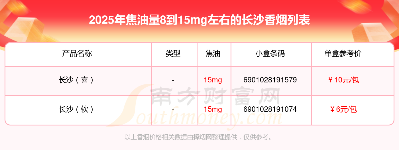 擇煙網(wǎng)為大家盤點了長沙香煙焦油量8到15mg左右的,分別有長沙(喜)、長沙(軟)等,具體價格如下: