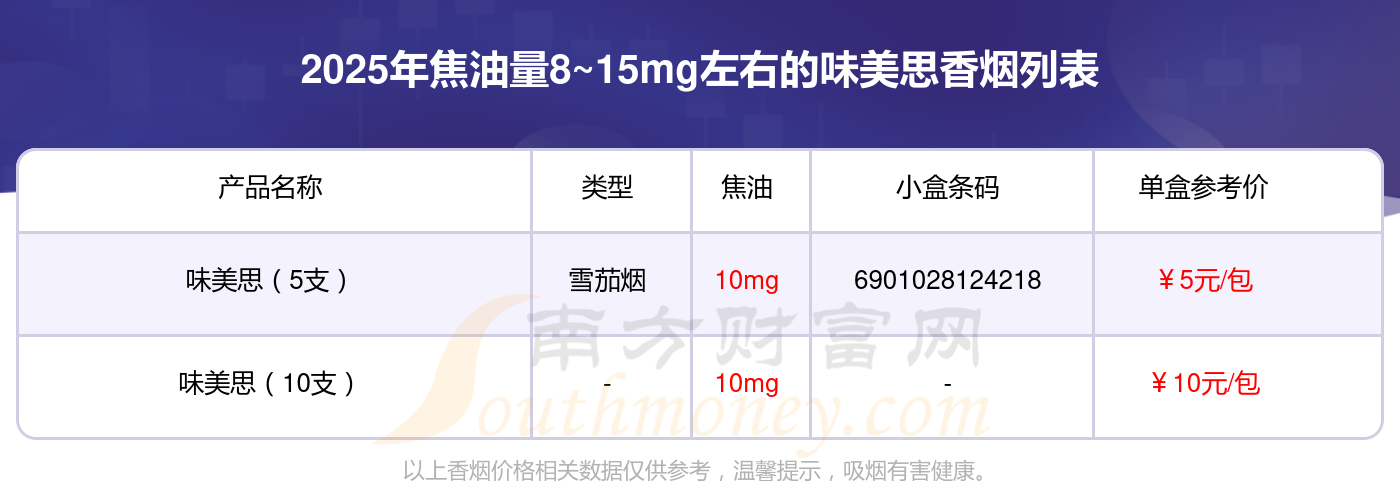 味美思香煙焦油量8~15mg左右的煙有味美思(5支)、味美思(10支)等,具體價格如下: