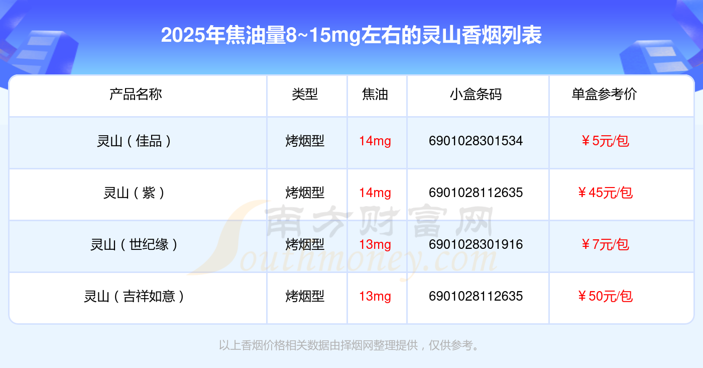 靈山香煙焦油量8~15mg左右的煙有靈山(佳品)、靈山(紫)、靈山(世紀(jì)緣)、靈山(吉祥如意)等,詳細(xì)價格如下: