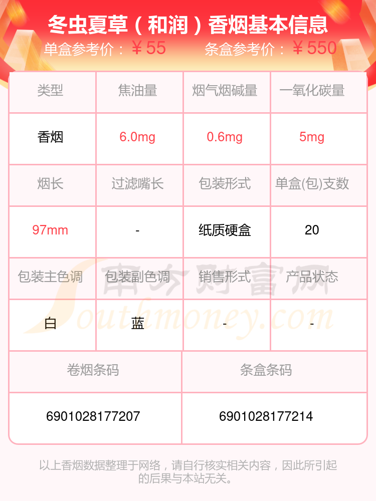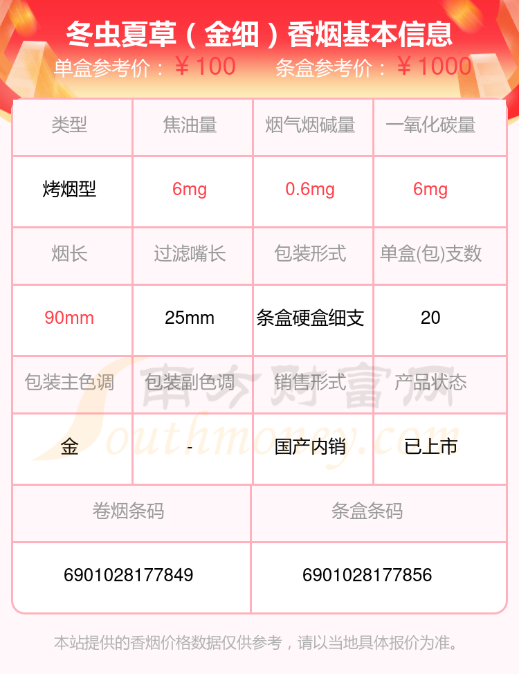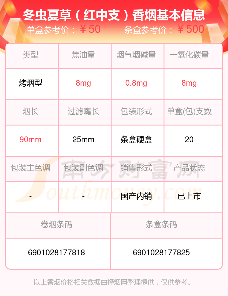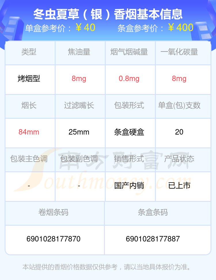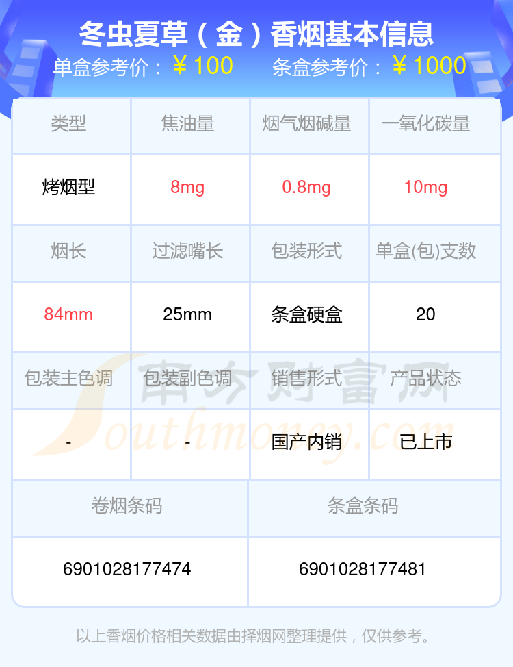 冬蟲夏草香煙焦油量10mg以下的煙有哪些?擇煙網(wǎng)為大家整理提供,分別有:冬蟲夏草(銀)、冬蟲夏草(金)、冬蟲夏草(銀)、冬蟲夏草(紅中支)、冬蟲夏草(雙中支)、冬蟲夏草(和潤)、冬蟲夏草(1248)、冬蟲夏草(黃金盛世)、冬蟲夏草(中支和潤)、冬蟲夏草(金細)等,具體價格如下: