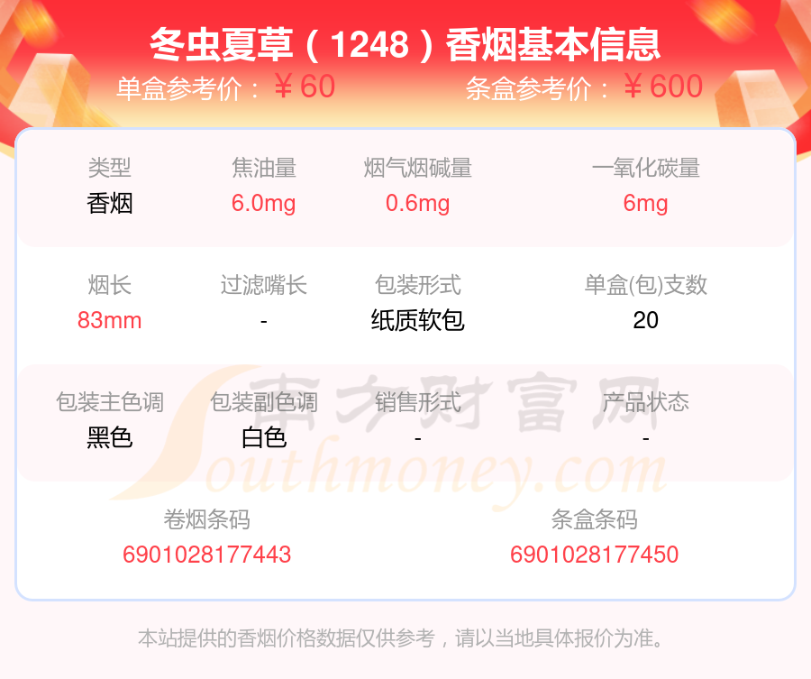 本站提供的香煙價格數(shù)據(jù)僅供參考,請以當?shù)鼐唧w報價為準。