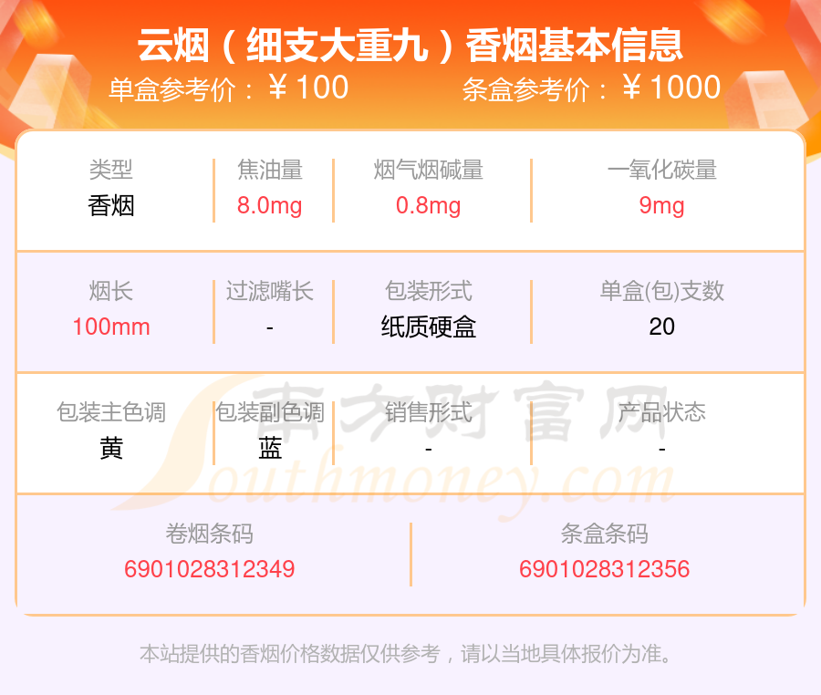 云煙(細支大重九)條盒參考價:1000元