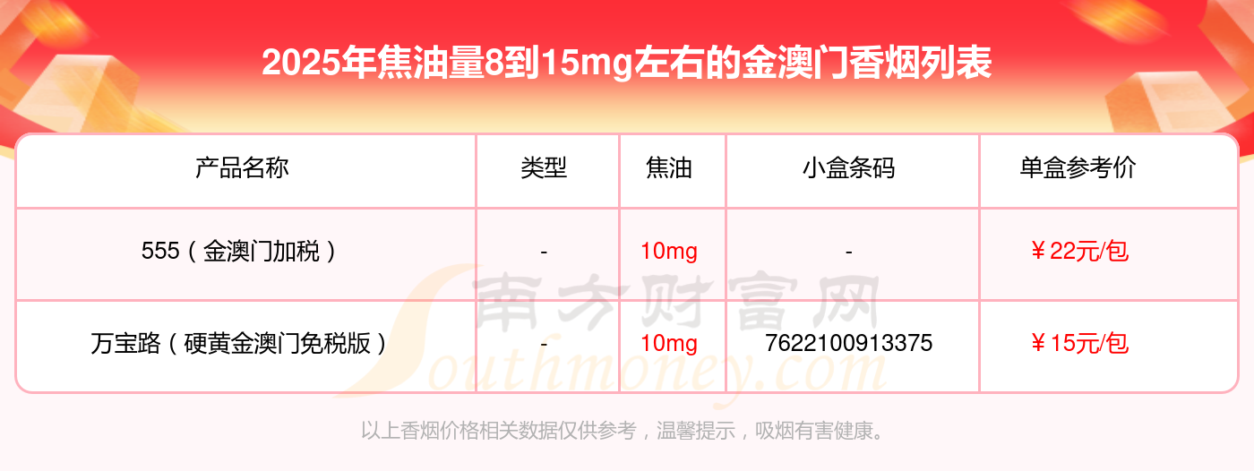 金澳門香煙焦油量8到15mg左右的煙分別有555(金澳門加稅)參考價(jià)22元/包、萬寶路(硬黃金澳門免稅版)參考價(jià)15元/包等。