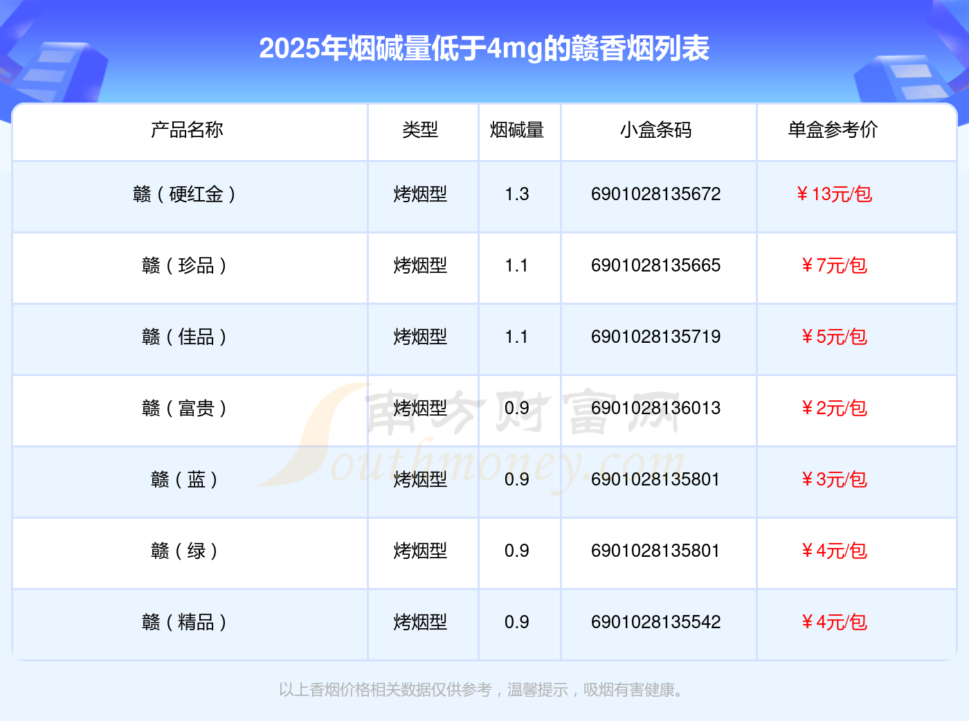 擇煙網(wǎng)為大家盤點(diǎn)了煙堿量低于4mg的贛香煙,有贛(硬紅金)、贛(珍品)、贛(佳品)、贛(富貴)、贛(藍(lán))、贛(綠)、贛(精品)等,詳細(xì)價(jià)格如下: