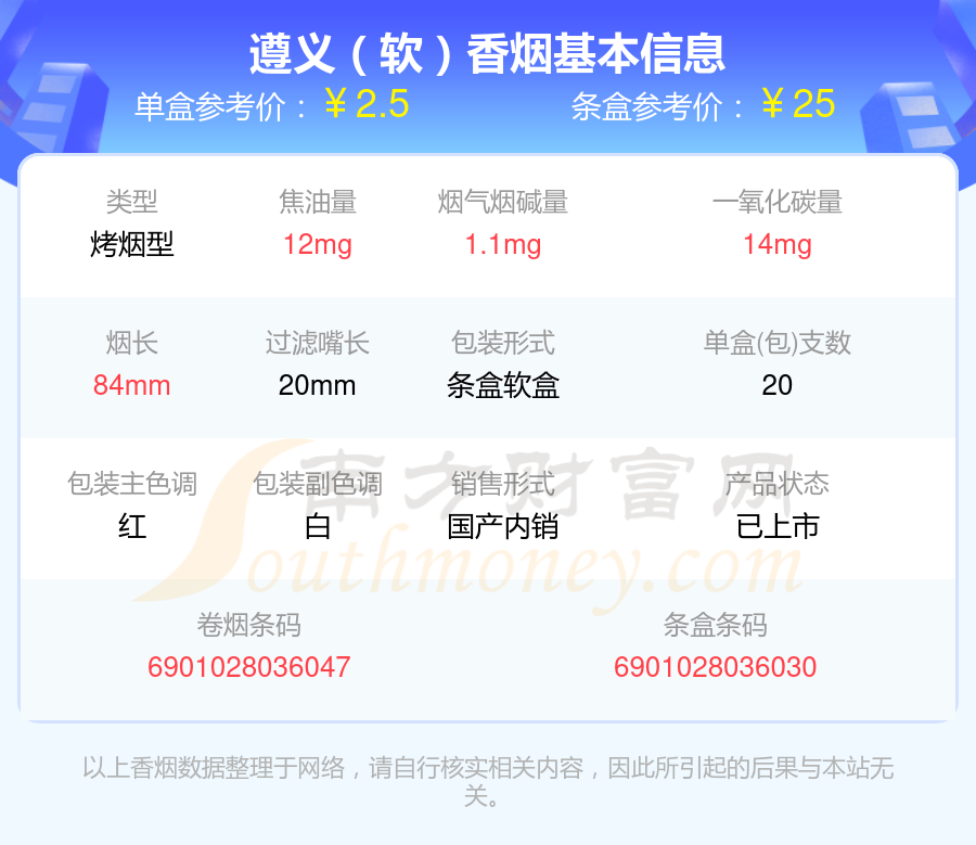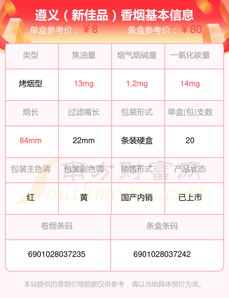 遵義香煙尼古丁1至2mg的煙有遵義(軟高)、遵義(精品)、遵義(新佳品)、遵義(新精品)、遵義(硬高)、遵義(軟)等,詳細(xì)價(jià)格如下: