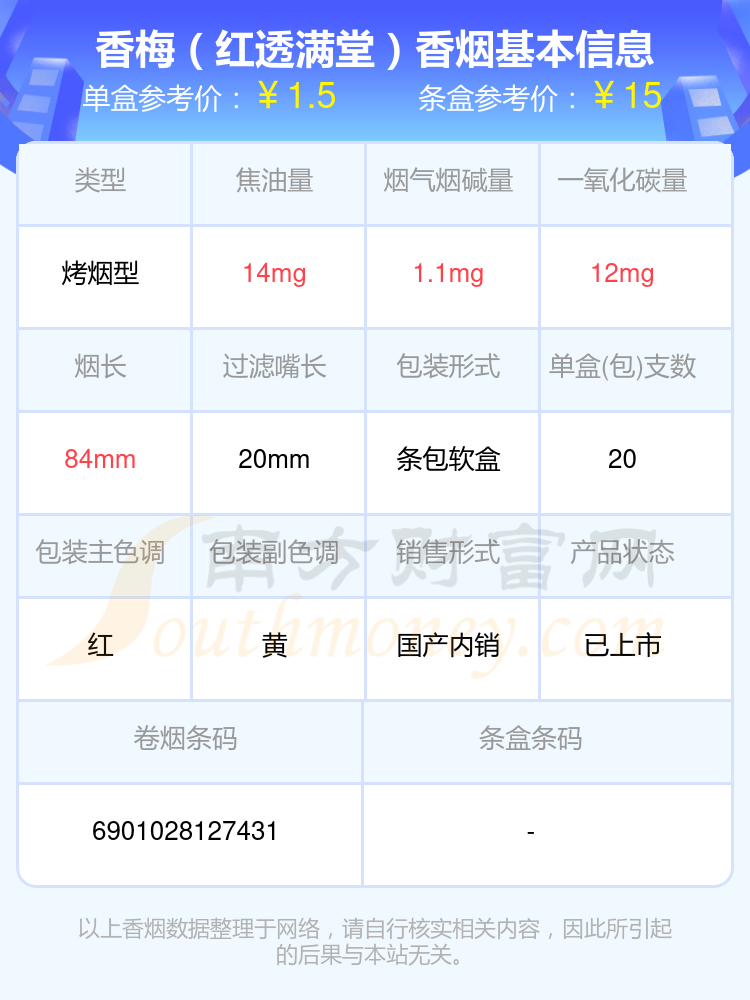 香梅香煙煙堿低于1.5mg的煙分別有香梅(藍(lán)透)參考價(jià)1.5元/包、香梅(紅透滿堂)參考價(jià)1.5元/包等。