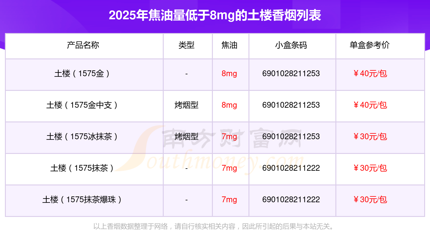 土樓香煙焦油量低于8mg的煙有哪些?擇煙網(wǎng)為大家整理提供,分別有:土樓(1575金)、土樓(1575金中支)、土樓(1575冰抹茶)、土樓(1575抹茶)、土樓(1575抹茶爆珠)等,具體價格如下: