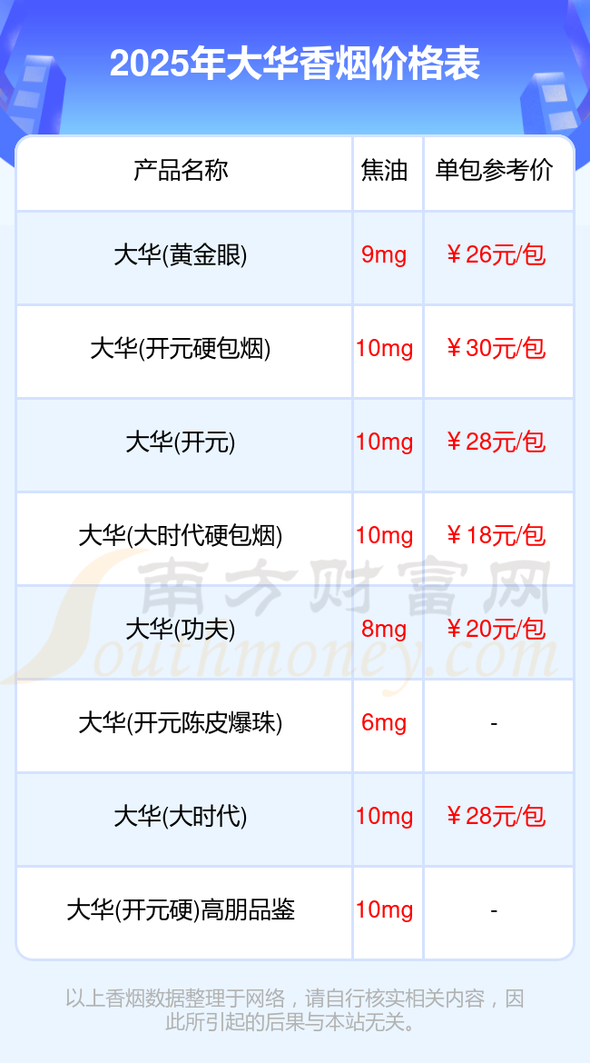 大華(開元硬包煙)參考價(jià)30.0元/包、大華(大時(shí)代)參考價(jià)28.0元/包、大華(開元)參考價(jià)28.0元/包、大華(黃金眼)參考價(jià)26.0元/包、大華(功夫)參考價(jià)20.0元/包。