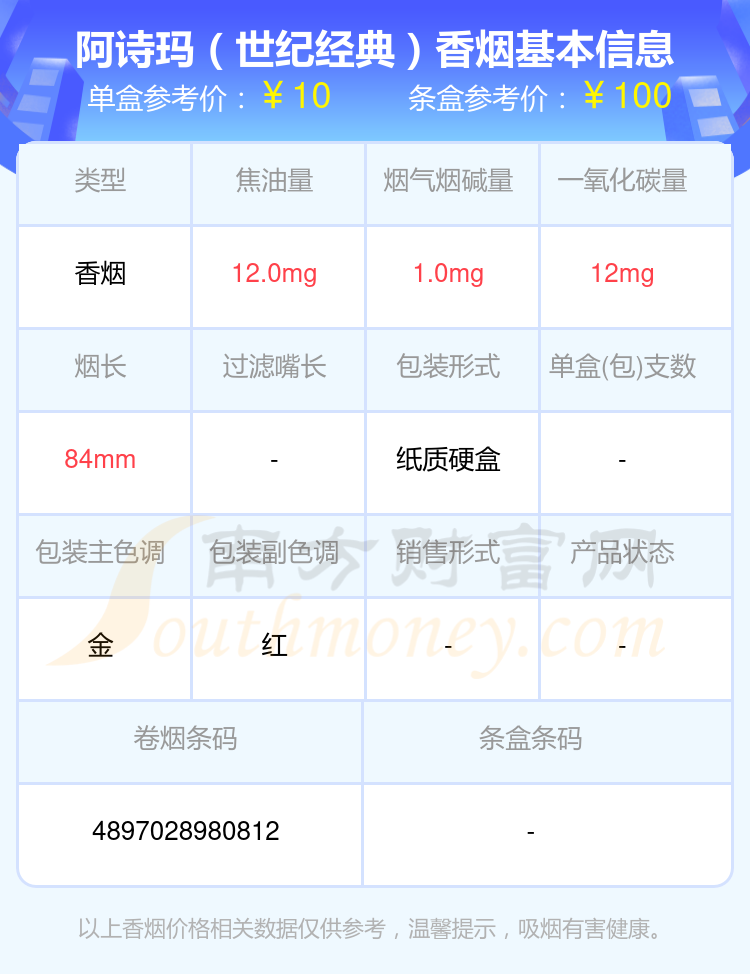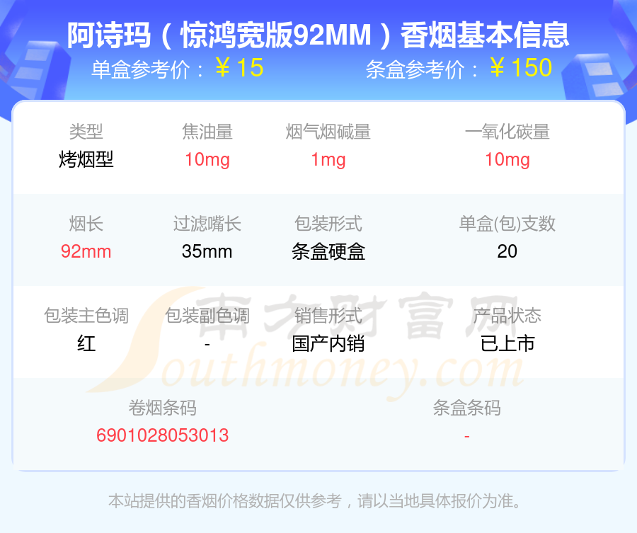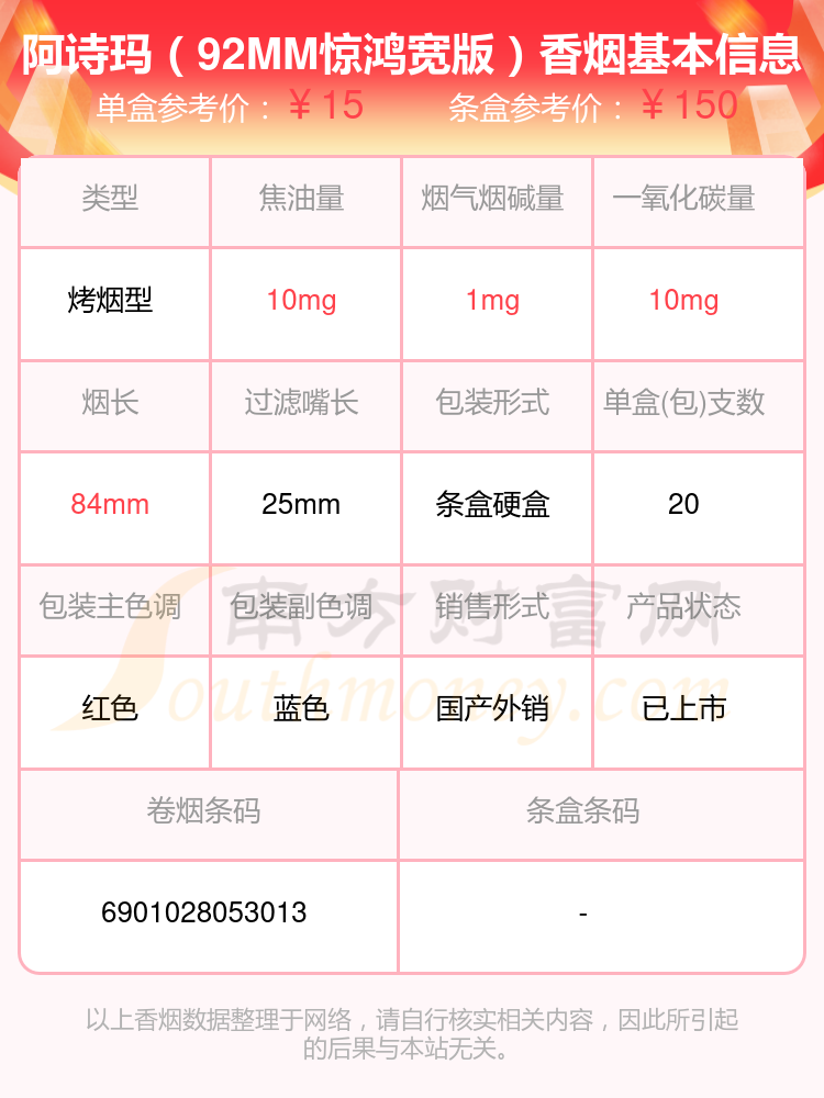 阿詩瑪(細支)參考價18元/包、阿詩瑪(細)參考價18元/包、阿詩瑪(92MM驚鴻寬版)參考價15元/包、阿詩瑪(驚鴻寬版92MM)參考價15元/包、阿詩瑪(世紀經(jīng)典)參考價10.0元/包等。