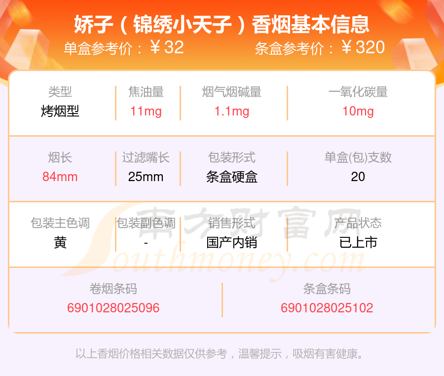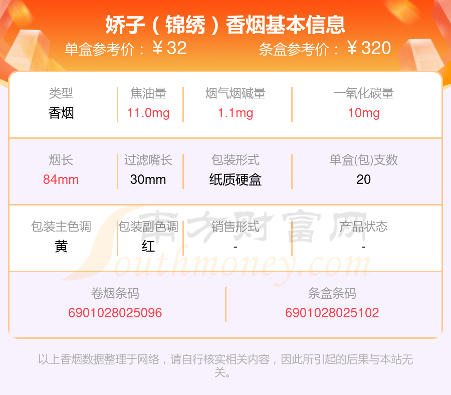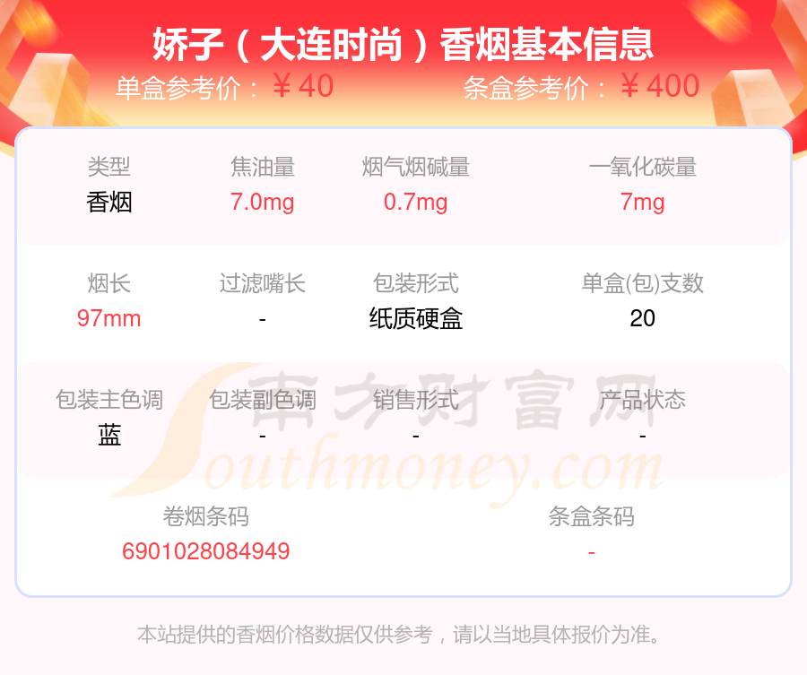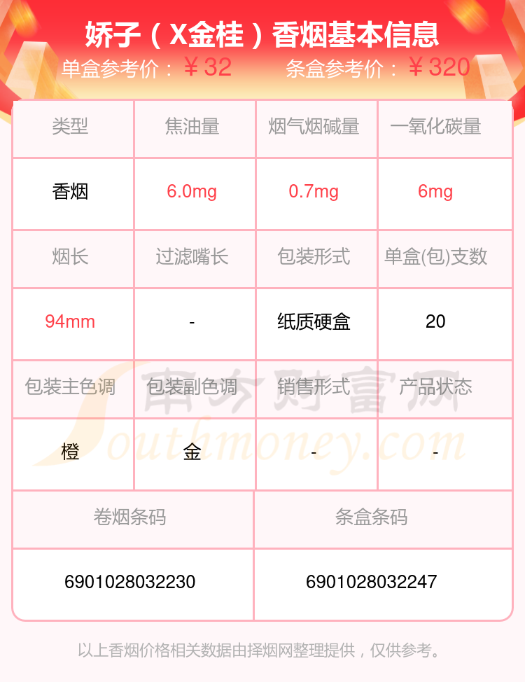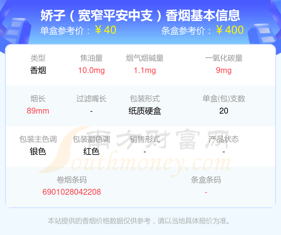 擇煙網(wǎng)為大家盤點了10-40元的嬌子香煙,分別有嬌子(大連時尚)參考價40.0元/包、嬌子(寬窄平安中支)參考價40.0元/包、嬌子(軟寬窄平安)參考價35.0元/包、嬌子(五糧濃香細(xì)支)參考價35.0元/包、嬌子(硬功夫7mg)參考價33.0元/包、嬌子(錦繡)參考價32.0元/包、嬌子(X金桂)參考價32.0元/包、嬌子(錦繡小天子)參考價32元/包、嬌子(龍涎香韻)參考價30.0元/包、嬌子(寬窄好運)參考價30.0元/包等。