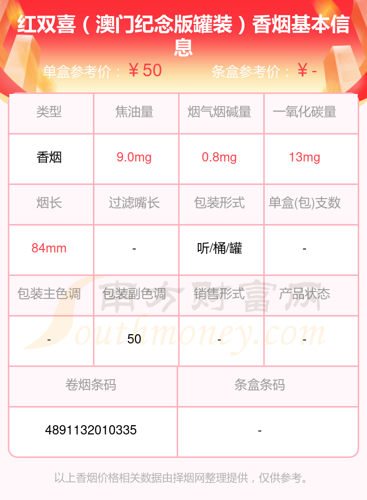 紅雙喜(吉祥龍鳳罐裝)參考價68.0元/包、紅雙喜(澳門紀念版罐裝)參考價50.0元/包等。