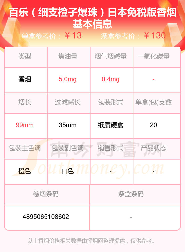 百樂(細支橙子爆珠)日本免稅版單盒參考價:13元