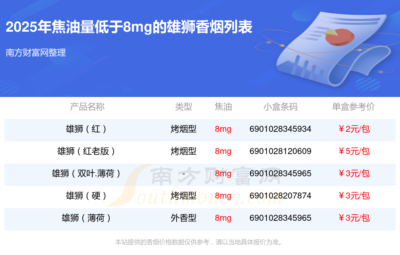 雄獅(紅)參考價(jià)2元/包、雄獅(紅老版)參考價(jià)5元/包、雄獅(雙葉.薄荷)參考價(jià)3元/包、雄獅(硬)參考價(jià)3元/包、雄獅(薄荷)參考價(jià)3元/包等。