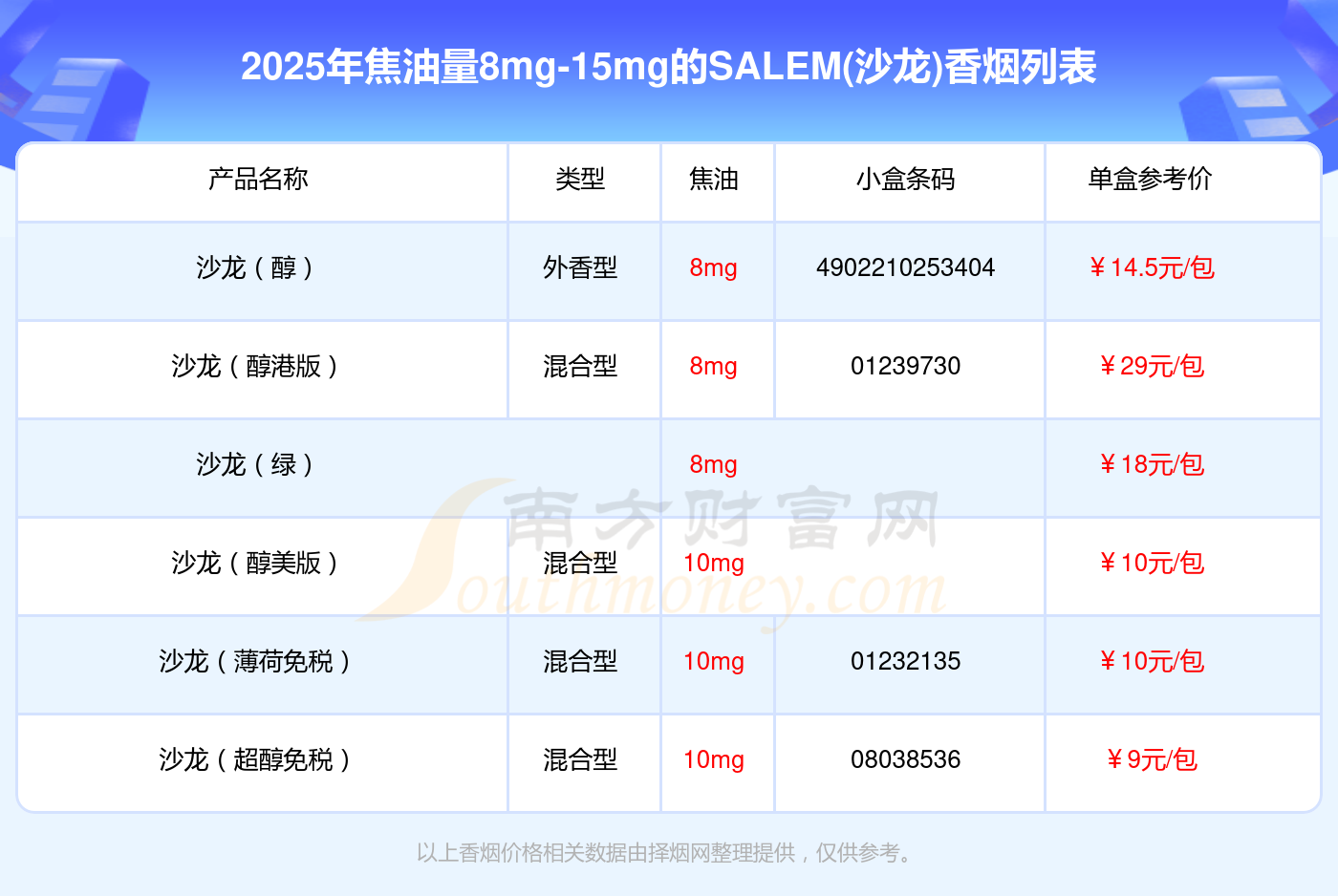 SALEM(沙龍)香煙焦油量8mg-15mg的有哪些?擇煙網(wǎng)為大家整理提供,分別有: