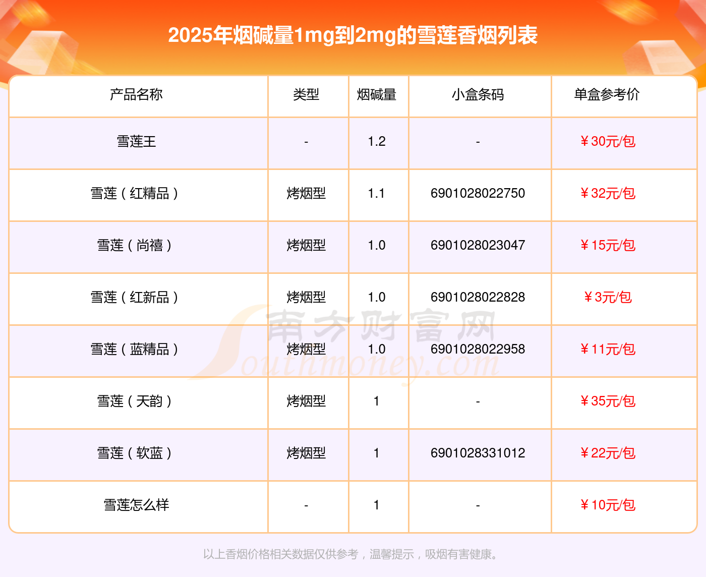 擇煙網(wǎng)為大家盤點了雪蓮香煙煙堿量1mg到2mg的煙,有以下這些: