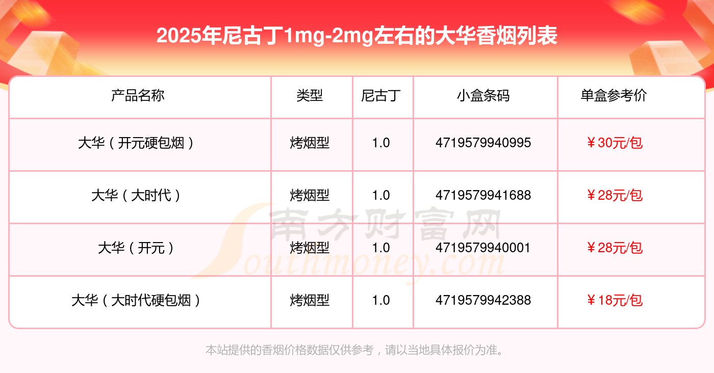 大華香煙尼古丁1mg-2mg左右的煙有大華(開(kāi)元硬包煙)、大華(大時(shí)代)、大華(開(kāi)元)、大華(大時(shí)代硬包煙)等,詳細(xì)價(jià)格如下: