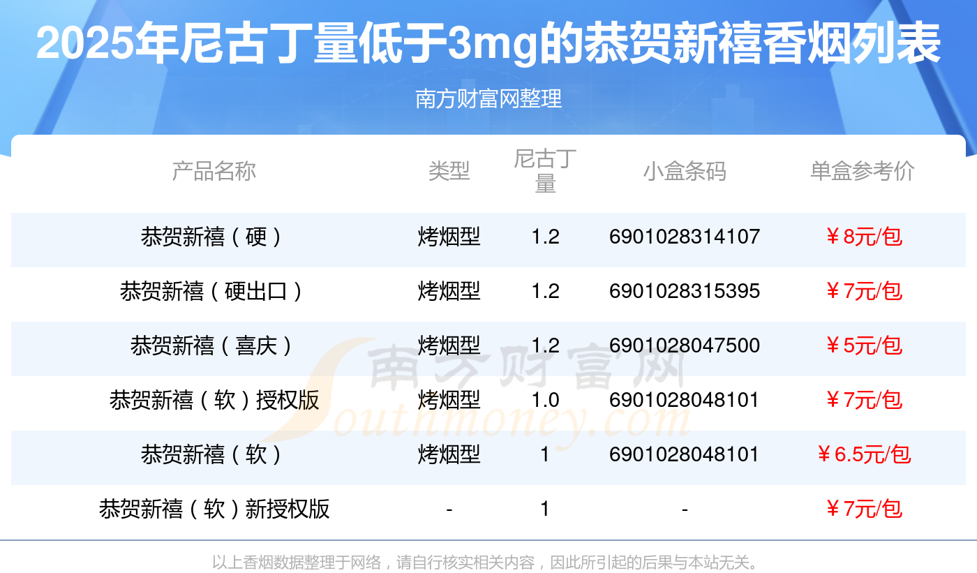 恭賀新禧香煙尼古丁量低于3mg的煙分別有恭賀新禧(硬)參考價(jià)8元/包、恭賀新禧(硬出口)參考價(jià)7元/包、恭賀新禧(喜慶)參考價(jià)5元/包、恭賀新禧(軟)授權(quán)版參考價(jià)7.0元/包、恭賀新禧(軟)參考價(jià)6.5元/包、恭賀新禧(軟)新授權(quán)版參考價(jià)7元/包等。