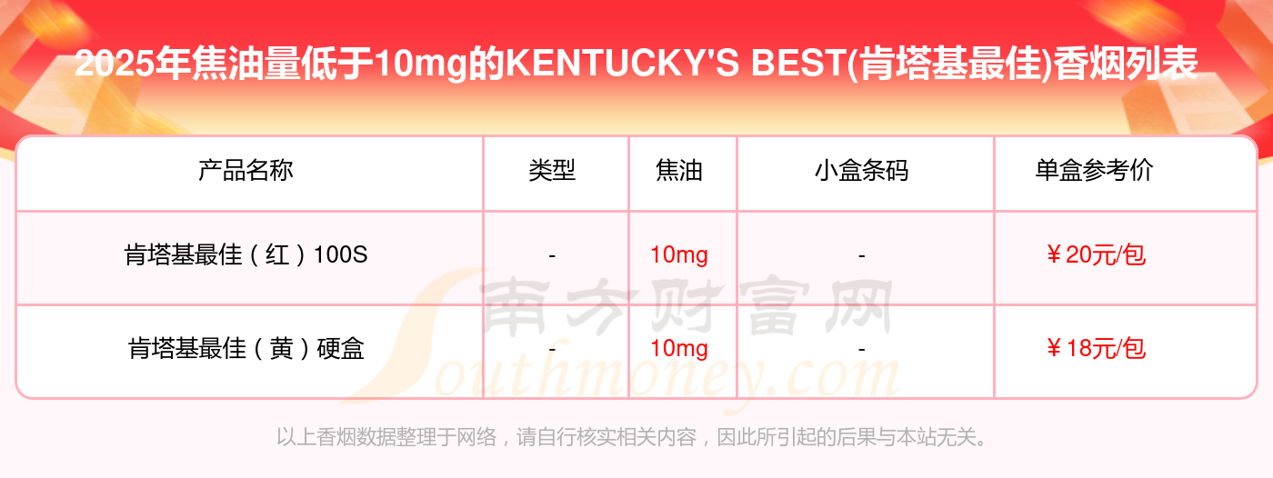 肯塔基最佳(紅)100S參考價(jià)20元/包、肯塔基最佳(黃)硬盒參考價(jià)18元/包等。