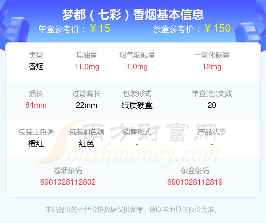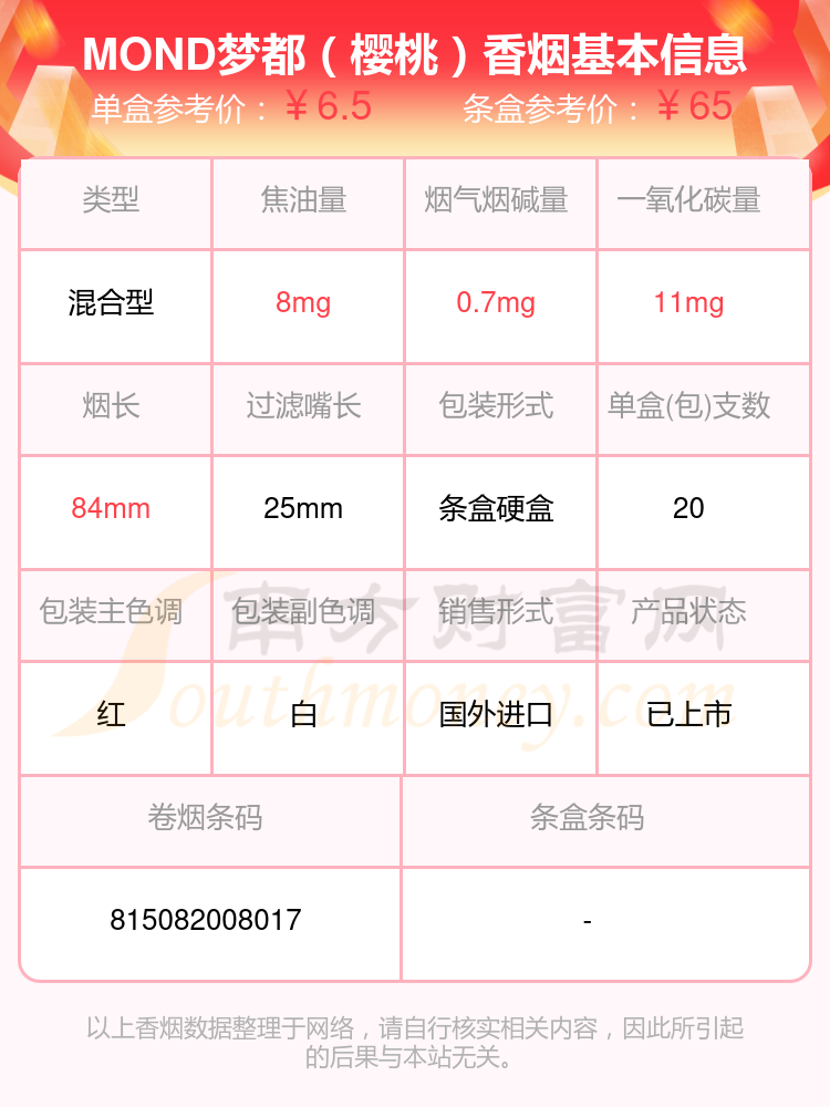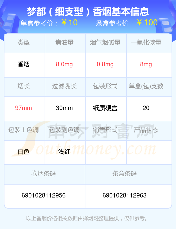 擇煙網(wǎng)為大家盤點了夢都香煙煙堿量低于1mg的,分別有夢都(七彩)、夢都(細(xì)支型)、夢都(薄荷型)、MOND夢都(櫻桃)等,詳細(xì)價格如下: