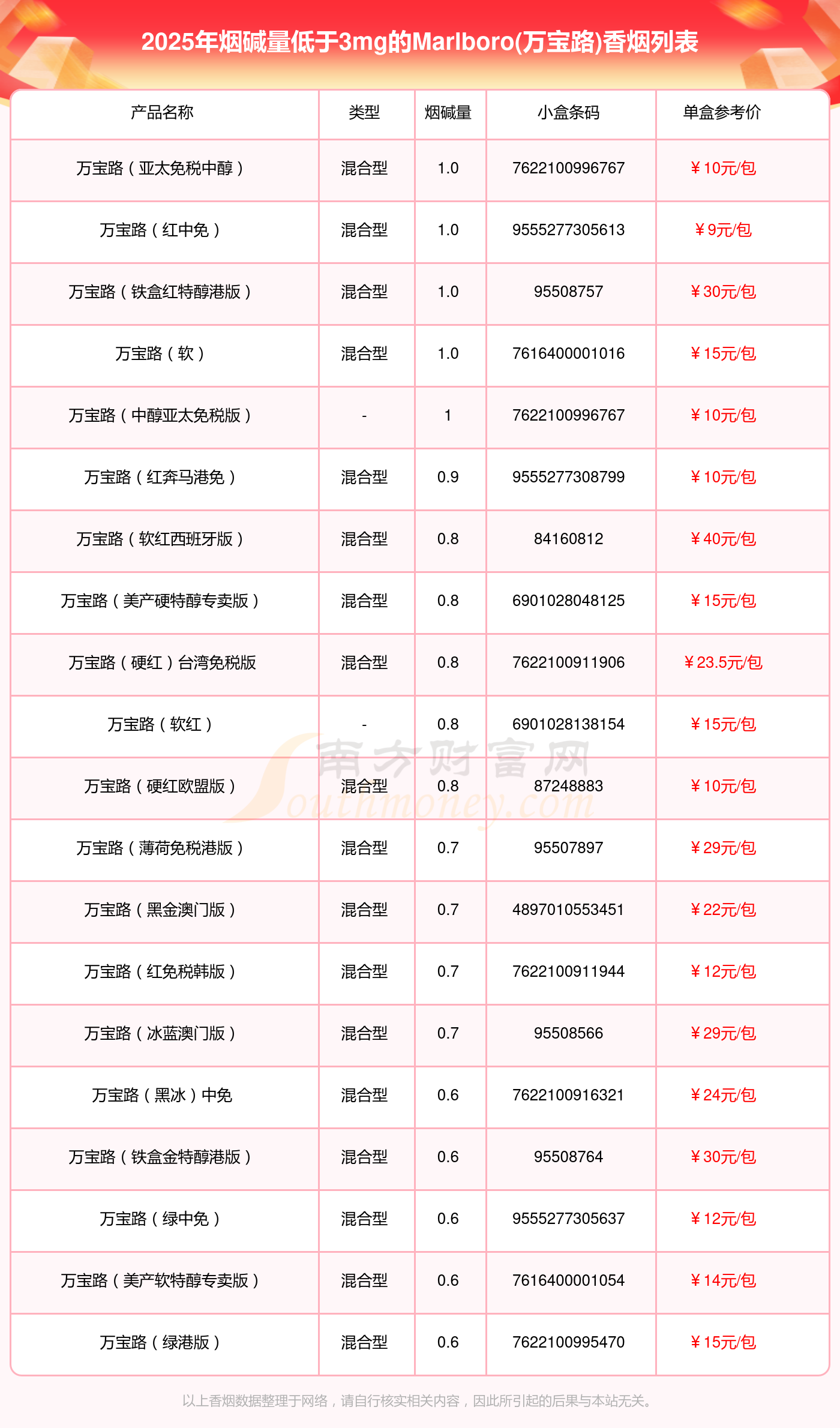 擇煙網(wǎng)為大家盤點了Marlboro(萬寶路)香煙煙堿量低于3mg的煙,有以下這些: