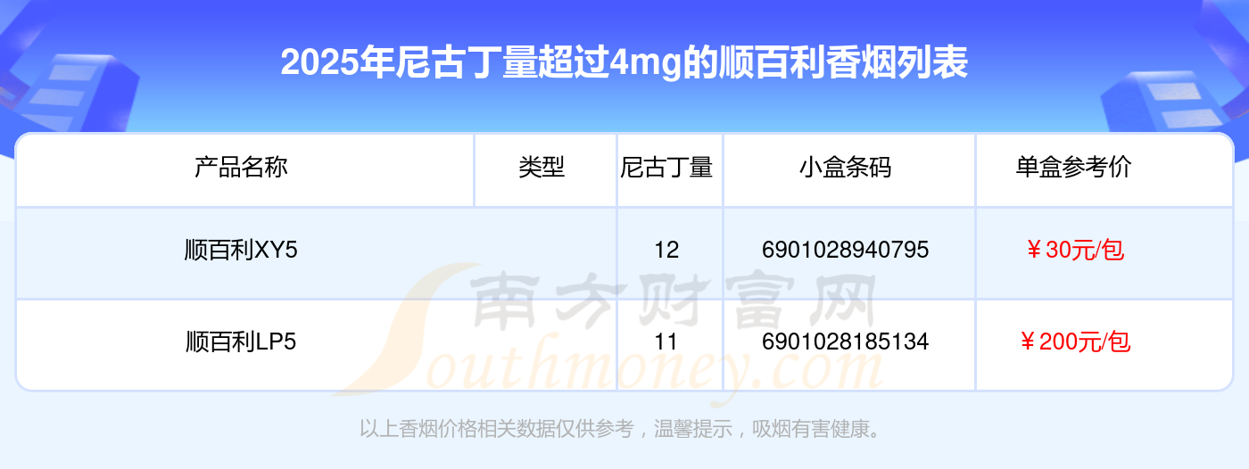 順百利香煙尼古丁量超過4mg的煙有哪些?擇煙網(wǎng)為大家整理提供,分別有:順百利XY5、順百利LP5等,具體價(jià)格如下: